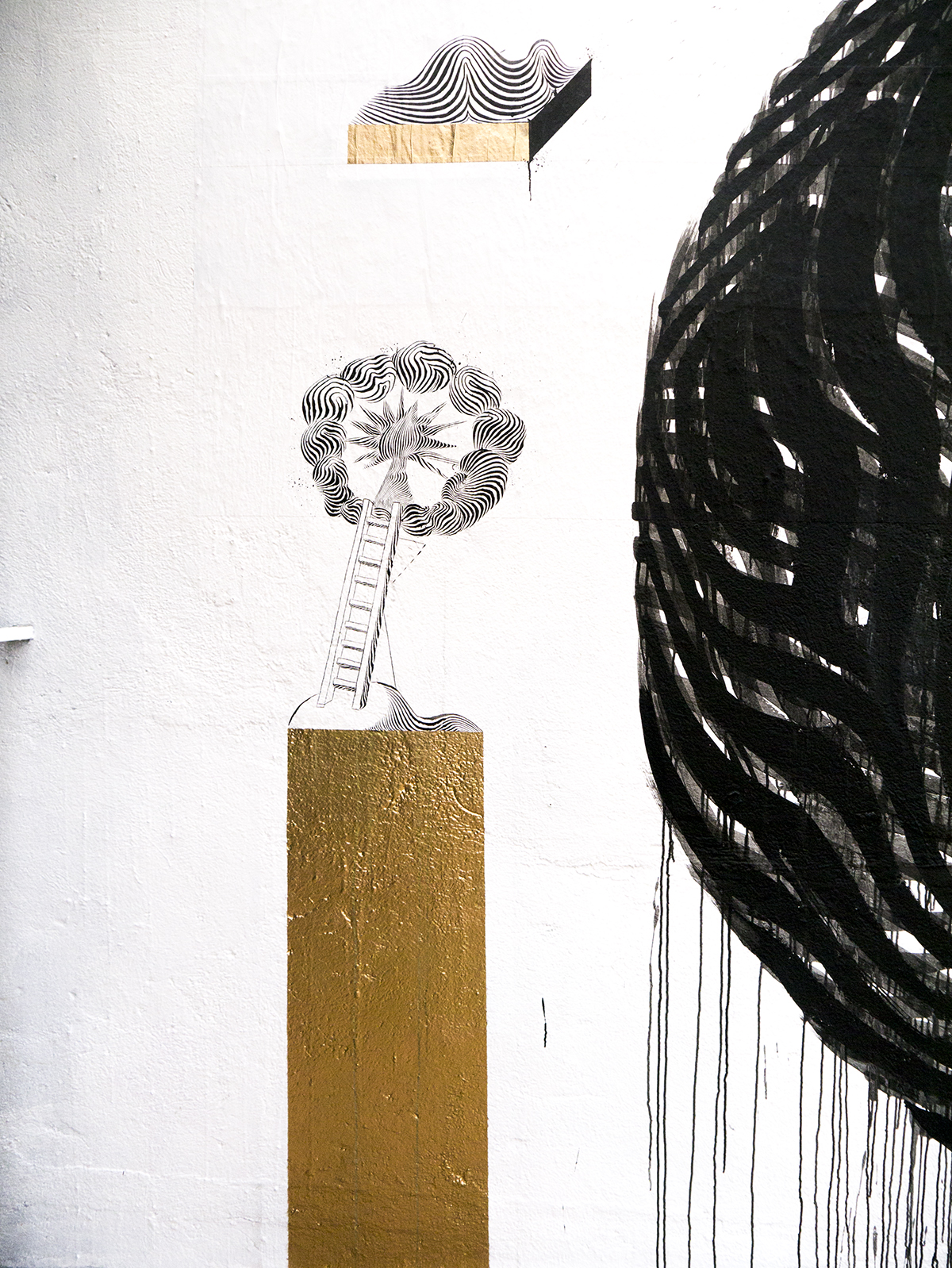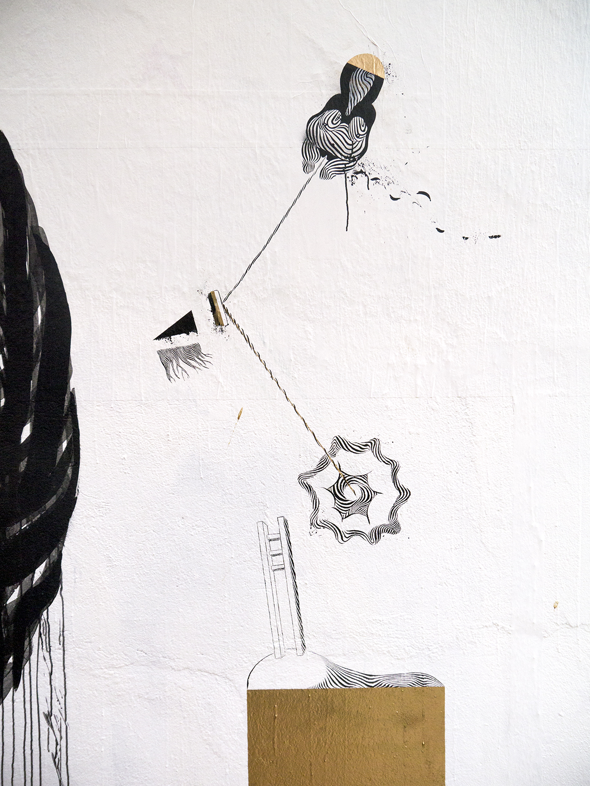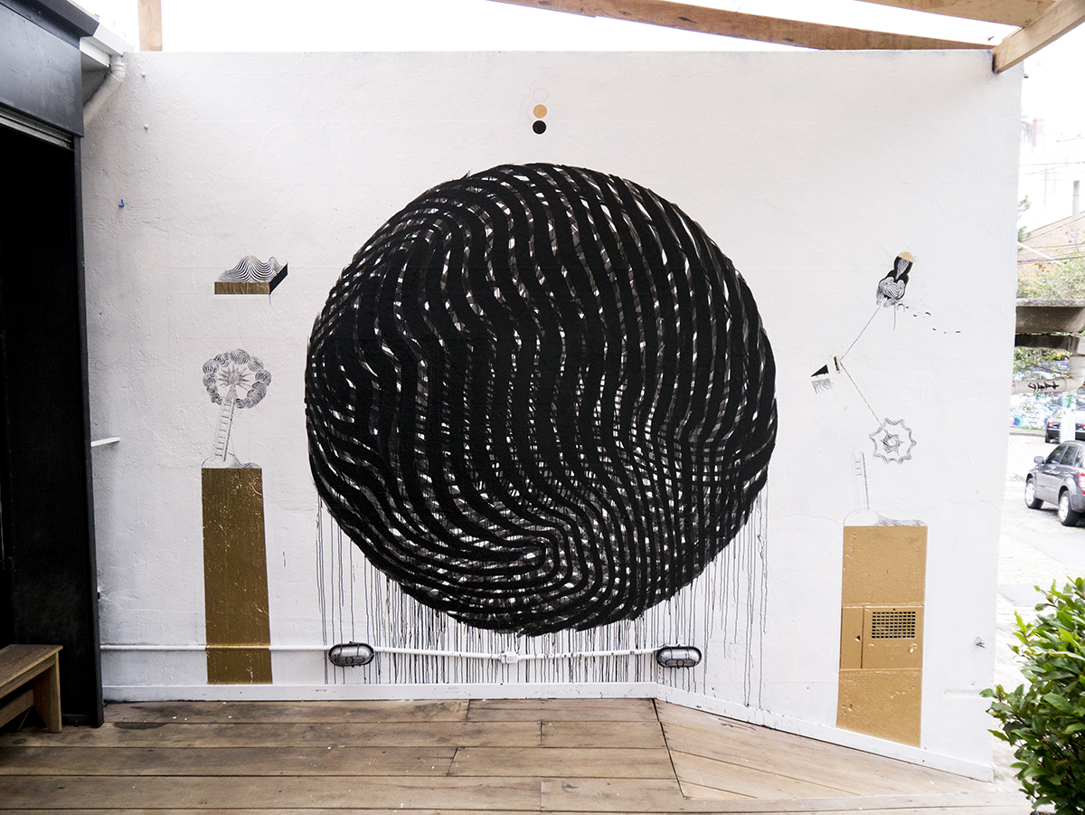 In “Almost Black” 2501 accogliamo con piacere la sua visione, analizzando il lavoro dell’artista emerge infatti la forte e importante relazione con le linee, le stesse sono il fulcro dell’operato dell’interprete, ciò che ne caratterizza le opere, attraverso esse e con esse l’artista dà vita alle proprie figure sviscerando su parete i propri misticismi ed il personale immaginario. Dopo il riuscitissimo inserimento di un nuova componente cromatica come il color oro, 2501 nuovamente in Brasile porta avanti un concezione nuova, un qualcosa che avevamo già avuto l’opportunità di intravedere su una delle opere realizzate all’interno del MACRO (qui), l’avevamo assaporato restandone affascinati e curiosi di assistere ai conseguenti sviluppi. Per il lavoro di Roma l’artista aveva utilizzato una pennellata più corposa e ricca di colate, donando quindi al risultato finale una pesantezza maggiore, qui però anzitutto segue una differente dinamica lavorativa ed il risultato finale è un vero e proprio nuovo approccio, non si tratta di apportare in parte un livello di completezza maggiore, emerge piuttosto l’esigenza di 2501 di giustapporre il linguaggio video con quello pittorico attraverso la realizzazione di opere si spesse, ma fortemente caratterizzate da una sensazione di moto perenne. I lavori acquistano instabilità e carattere, il nero invade letteralmente la forma sferica, e come suggerisce il nome stesso dell’intervento, lascia pochissimi spiragli al bianco, la sensazione è quindi quella di una quasi tinta unica che avvolge la forma, osservando il lavoro notiamo come in tra le varie cavità concesse alla vista si mostrino i livelli precedenti, il tessuto che riveste il cuore stesso dell’intervento e che va ad un aumentare una forte sensazione di profondità ed appunto di movimento di tutta l’opera finale.