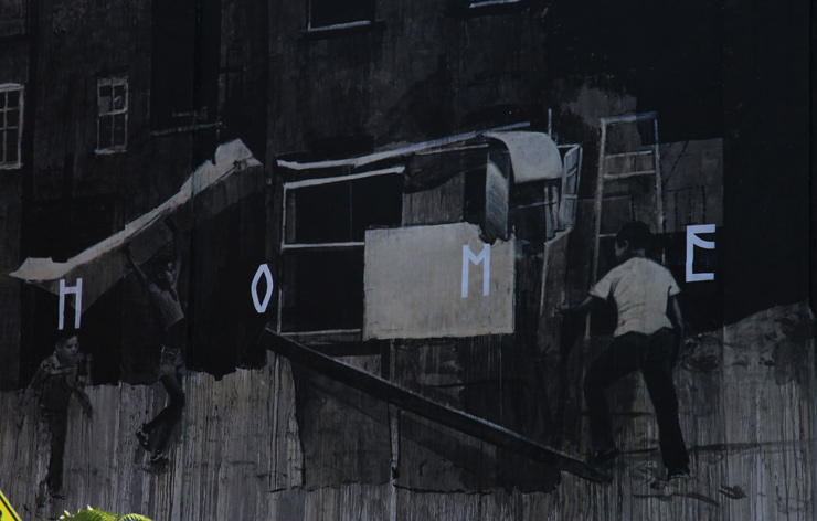 This wall is based on a photo that Martha Cooper took in 1978. It was published in the book Street Play. It shows some kids in New York building a house out of scraps.