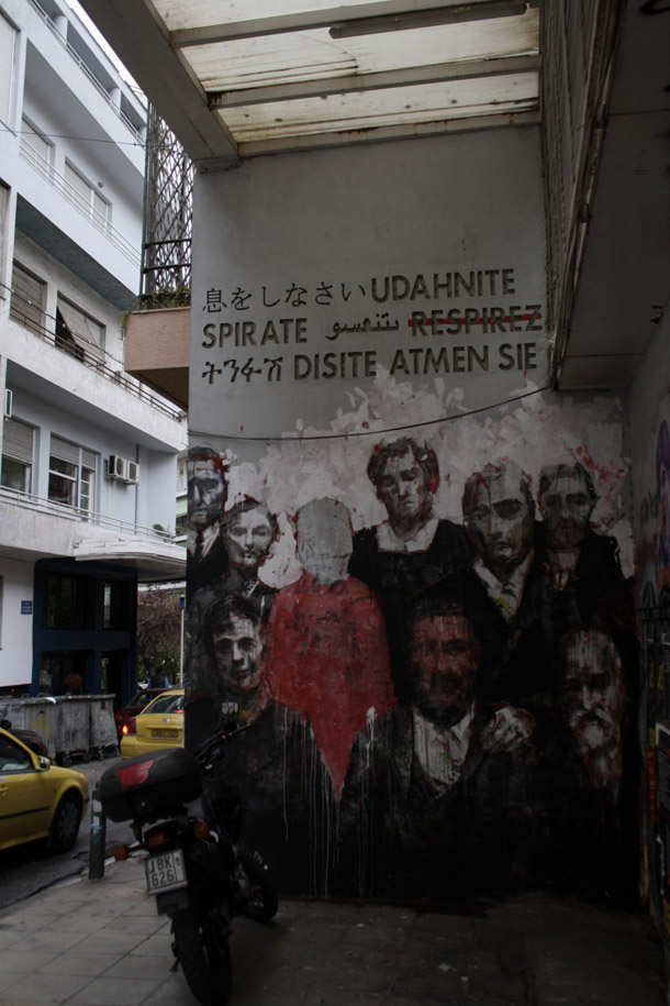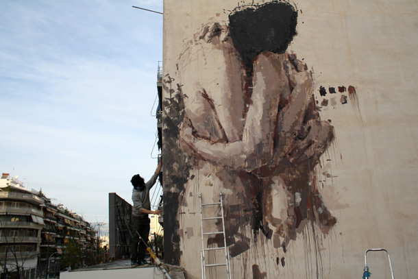 In Grecia Borondo ha dipinto due facciate, se la prima mostra due corpi contorcersi su se stessi in un lungo abbraccio, la seconda è decisamente più ridondante con volti e figure tetre intente ad osservare l’ignaro passante.