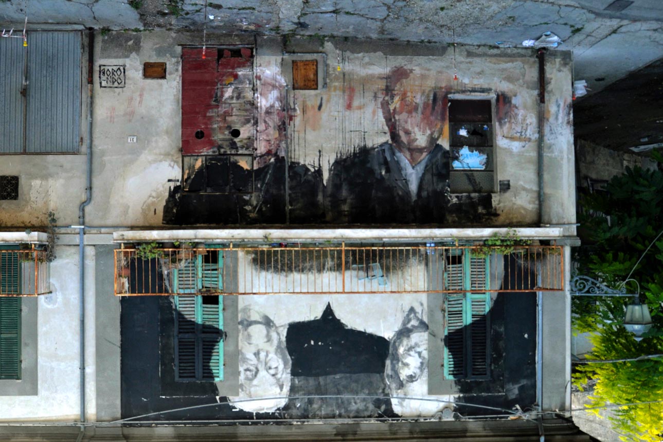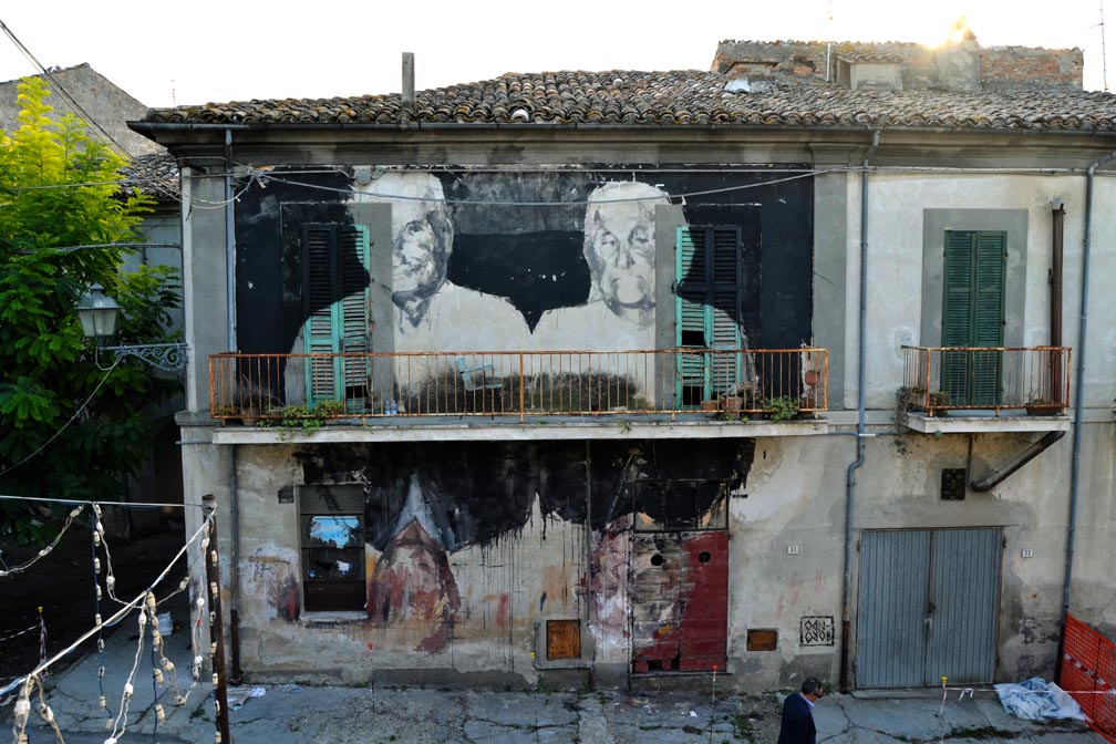 Partendo dal ritrovamento di una vecchia fotografia ingiallita direttamente all’interno, Borondo per la rassegna segna l’aspetto esteriore della parete direttamente con i volti dei suoi vecchi ed ultimi proprietari. Il disegno quindi prende ampia ispirazione dai volti raffigurati ma piuttosto che una mera riproduzione su parete, lo spagnolo decide di applicare un interessante, ed inconsueto, effetto a specchio, nella parte più bassa con tonalità grige e cupe l’immagine dei due anziani, nella parte inferiore invece gli stessi volti a colori, quasi impercettibili i tratti dei volti, eppure vivi attraverso i colori e le pennellate dell’artista. Borondo gioca con il doppio lavoro sussurrandoci l’intenzione di voler ritrarre da una parte un istantanea del tempo con la grande foto, tetra e scura uno spaccato di vita perso nelle pieghe del tempo, dall’altra gli spiriti stessi, le anime della casa che sono li a vegliare tra i muri scrostati, i ciottoli e le scale pericolanti, districandosi e togliendosi di dosso la polvere e le intemperie del tempo, ancora una volta poesia pura.