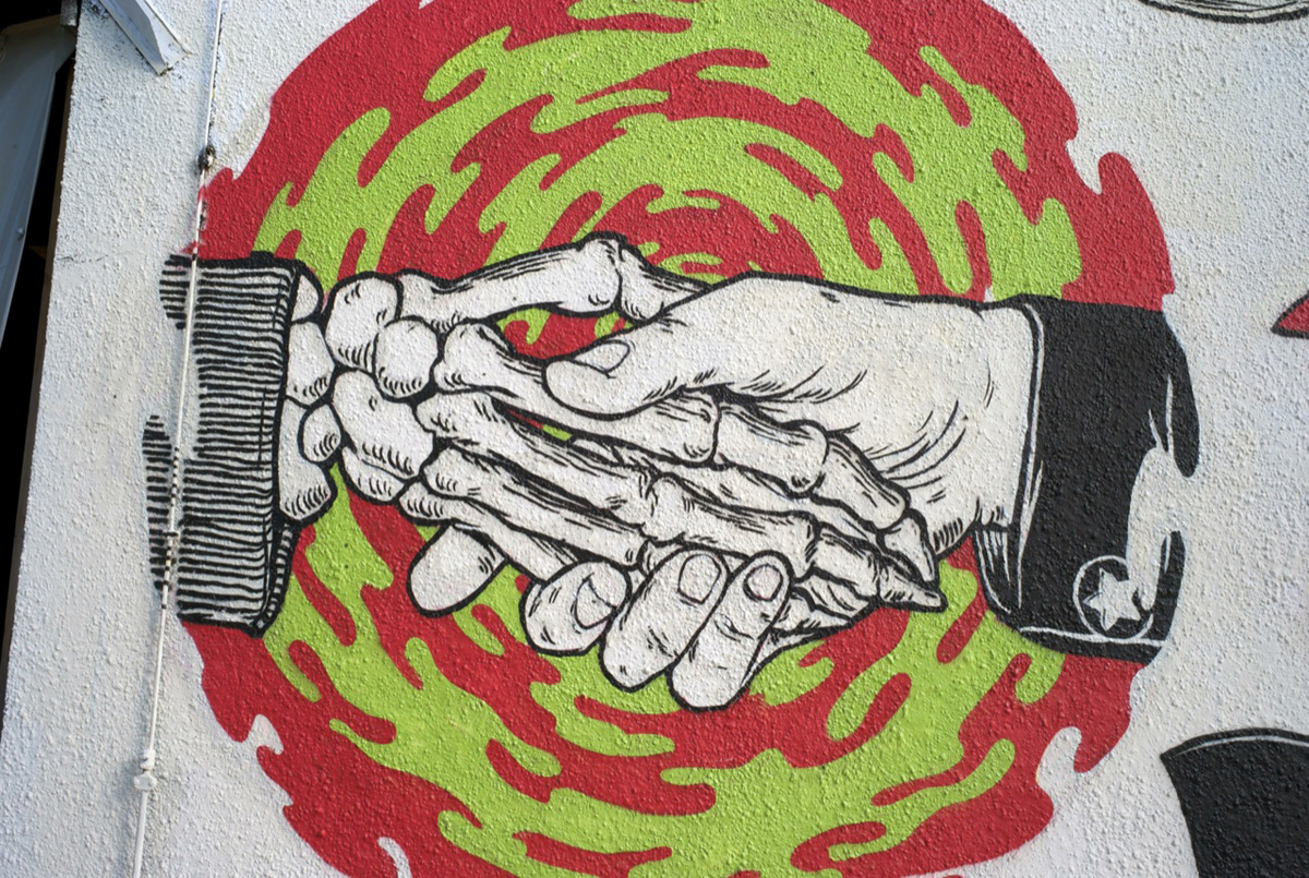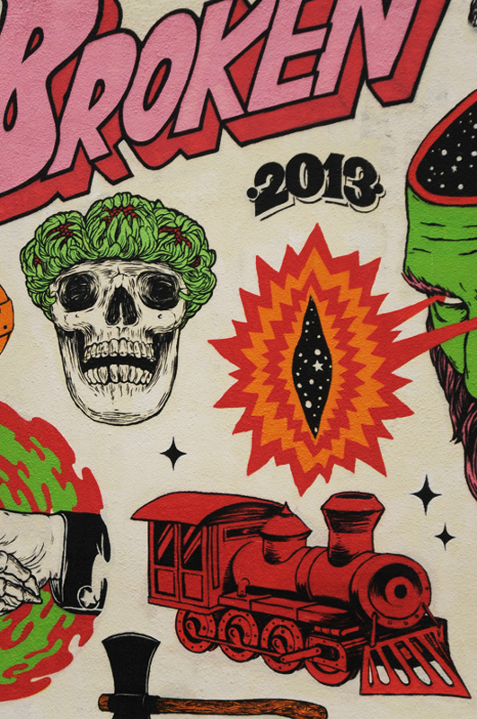 Attraverso uno stile fortemente proprio i Broken Fingaz portano avanti tematiche al limite del surreale, le forti influenze pop coniugate con una passione per l’horror, il trash e lo splatter danno vita al particolare tratto stilistico che accomuna i quattro artisti, sebbene siamo soliti rimanere affascinati dai lavori degli artisti, questa volta rimaniamo più seri visto che con questa parete il collettivo va a toccare argomenti più delicati e personali.