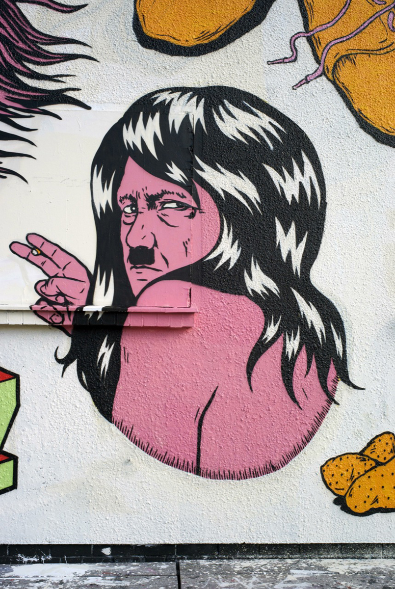 La nuova realizzazione firmata dal collettivo israeliano mette insieme una serie di elementi e figure che richiamano chiaramente una rivisitazione attraverso i proprio toni stilistici dell’olocausto. Elaborato a mò di stickers il lavoro infatti è una intricata configurazione di immagini più o meno grandi tra cui sicuramente avrete notato un Hitler donna, delle scarpette da lavoro, una improbabile stretta di mano tra un soldato ed un lavoratore dei lager, passando anche per la bottiglietta con dentro lo scheletro a simboleggiare i tanti esperimenti portati avanti dal governo tedesco durante il suo regime. I Broken Fingaz si dimostrano estremamente sensibili per questa nuova proposta, attraverso il proprio stile splatter/pop gli israeliano toccano una ferita aperta del proprio popolo, lo fanno presentando gli anatemi di quello che è stato un massacro, dipingendo con intelligenza volti e situazioni difficili, un manifesto per non dimenticare sbattuto in faccia in quel di Berlino, come sempre senza compromessi guardi quello che vedi.