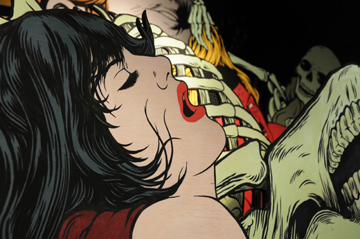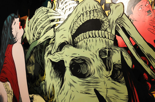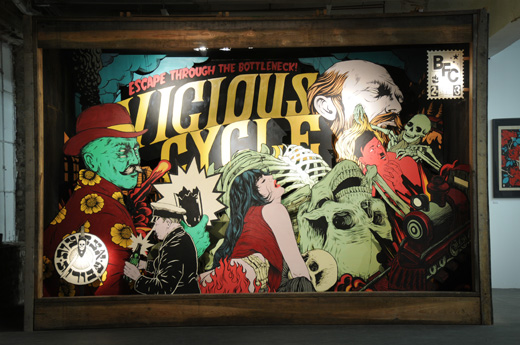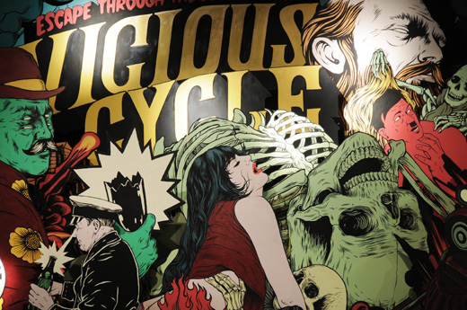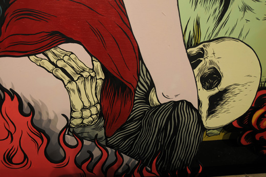 Proprio l’ultimo intervento quindi è in parte la scintilla per questa nuova opera dal titolo “Vicious Cycle”, ancora una volta ritroviamo i baffetti del dittatore a fare capolino sulla facciata, questa volta però abbiamo l’impressione di un attacco più netto e rimarcato con uno scheletro che alle spalle gli leva la parrucca bionda, quasi a togliere il velo sui misfatti dallo stesso compiuti, un nuovo anatema quindi per esorcizzare in parte gli orrori ed i dolori dell’olocausto. A completare l’elaborato troviamo poi una serie di immagini e scena ‘calde’ che si uniscono alla perfezioni con il consueto lettering a capo dell’opera, tutto da vedere attraverso la ricca selezione di scatti, enjoy it.