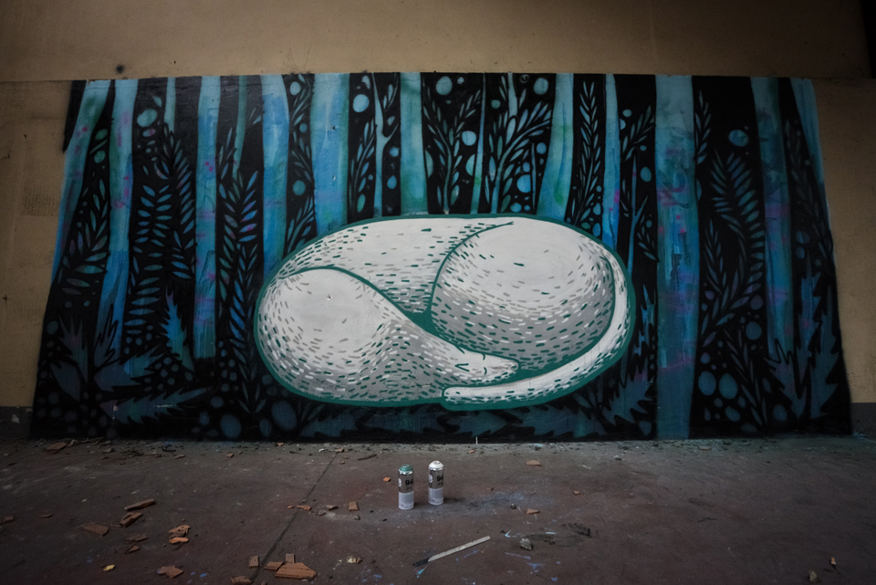 All’interno di un vecchio edificio abbandonato l’artista torna proponendo un altro dei suoi squisiti animali, a differenze però dell’ultime uscite, Dilen decide di arricchire quanto proposto donando anche una scenografia al lavoro. Troviamo così ancora una volta al centro del lavoro il canonico animale coricato su se stesso, alle spalle invece vediamo come sia state elaborata una fitta foresta, colori più scuri qui, in un paesaggio che sà di notturno ma allo stesso tempo con un bel contrasto tra la tranquillità della bestia e l’oscurità che lo circonda. Vita di tutti i giorni in questa delicatissima opera.