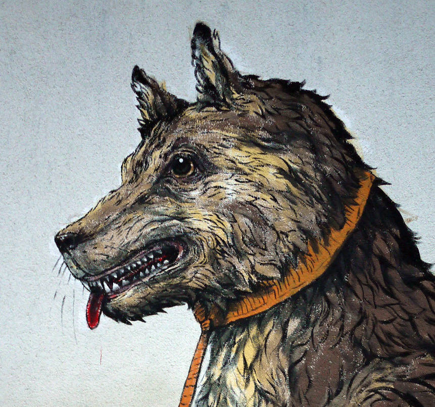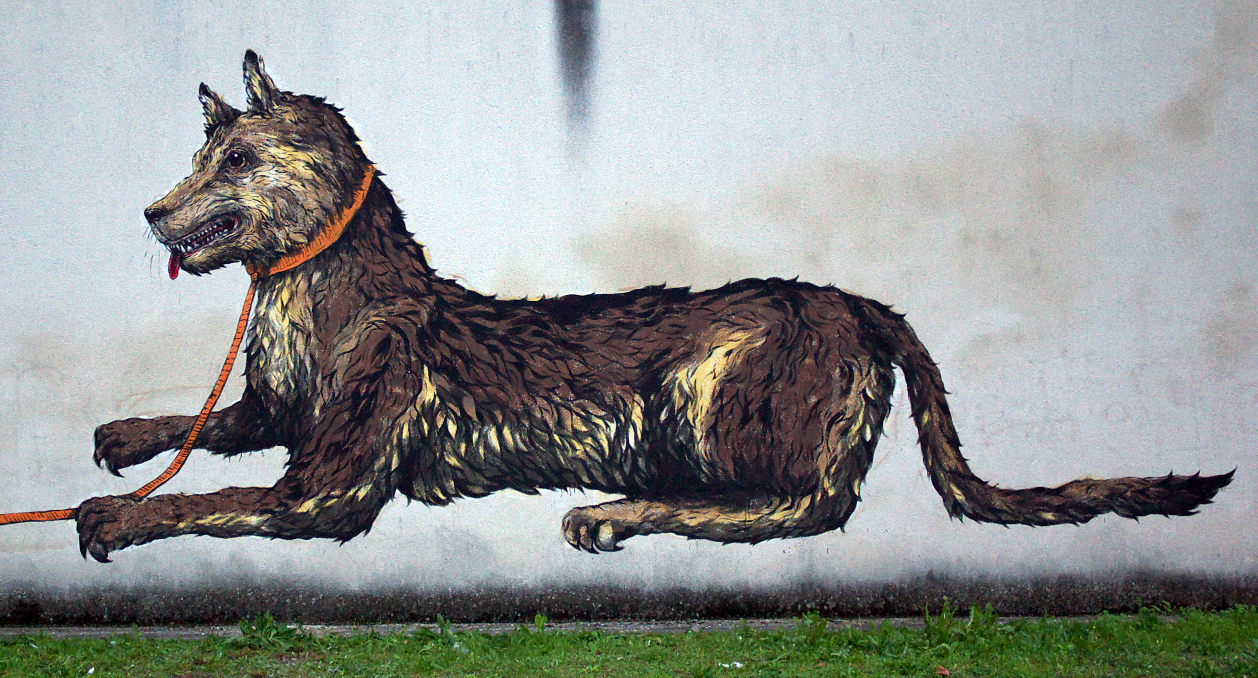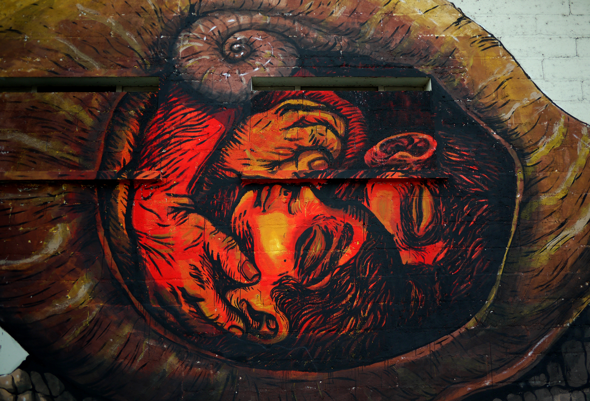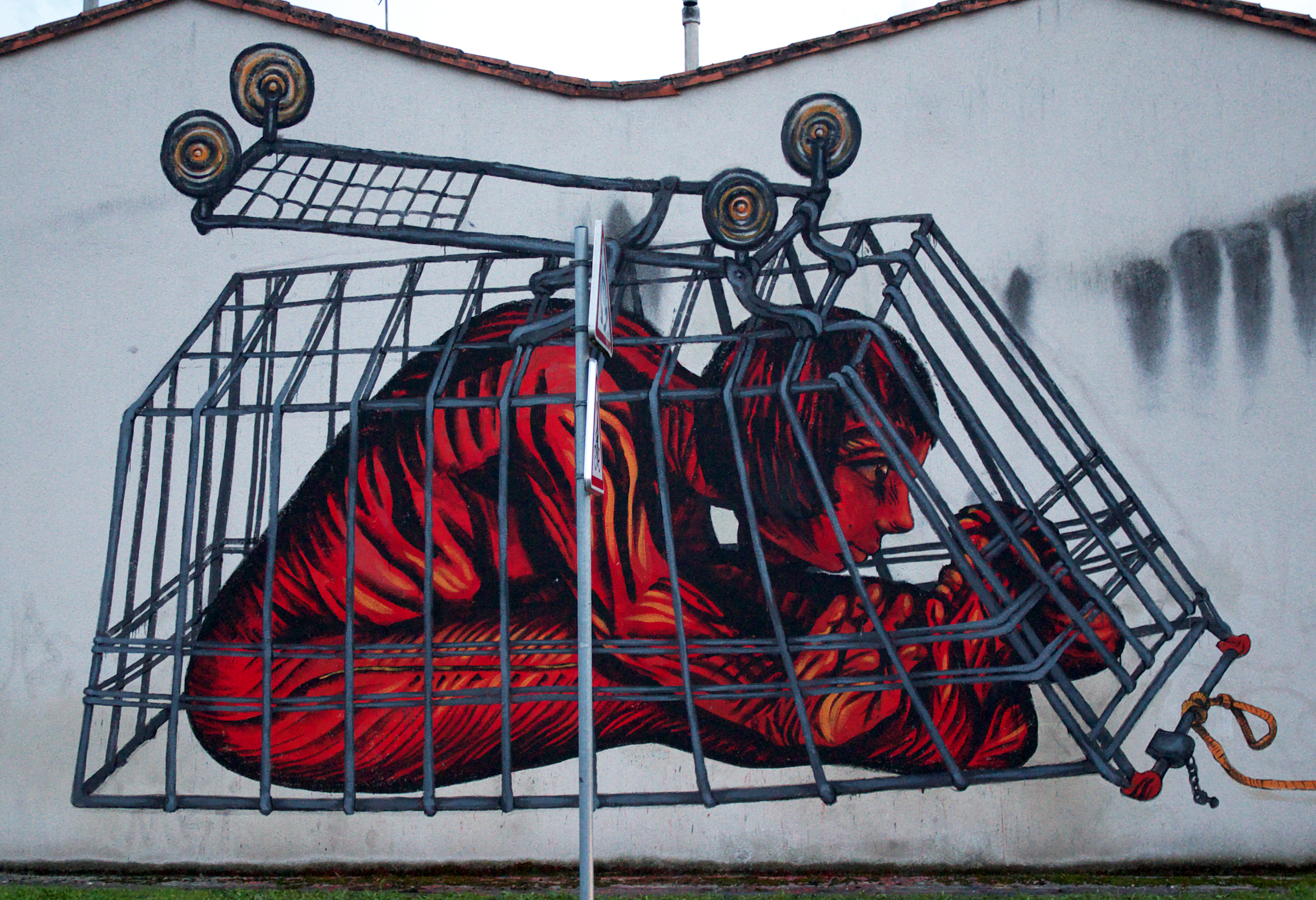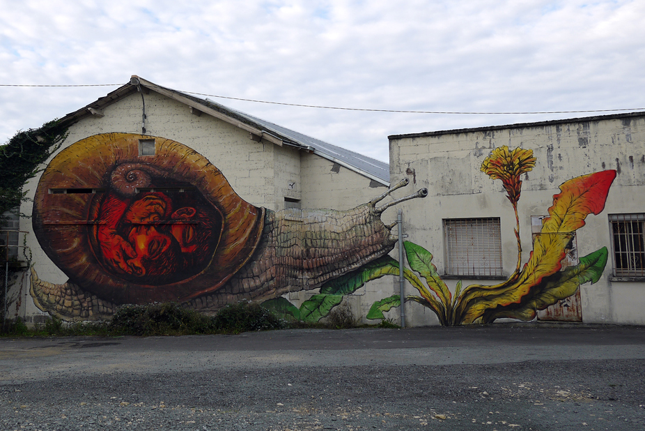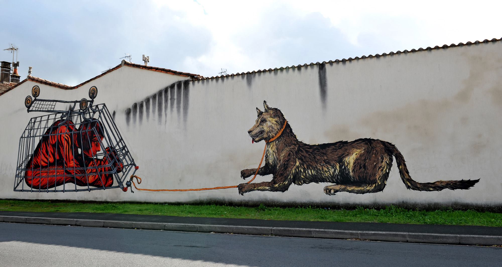 La miscela esplosiva continua così in grandissimo stile anche all’interno della bella rassegna francese con due differenti interventi. Lo spazio a disposizione è veramente notevole, i lavori dipinti si fanno apprezzare per la grande ricchezza di dettaglio che anima il tratto dei due artista, Ericailcane prosegue anche qui la personale visione animalesca della società e dell’uomo attraverso la pittura prima di una gigantesca lumaca con tanto di piante e fiori e poi nella rappresentazione di un cane legato al guinzaglio, Bastardilla si inserisce in queste due opere attraverso la personale ed unica visione, nel primo lavoro dipinge una fortissimo e laconico abbraccio tra un uomo ed una donna racchiusi proprio all’interno del guscio della lumaca, nella seconda opere invece sviluppa il corpo di una bambina che sembra quasi giocare racchiusa in una prigione fatta a carrello della spesa e legata proprio al guinzaglio del cane.