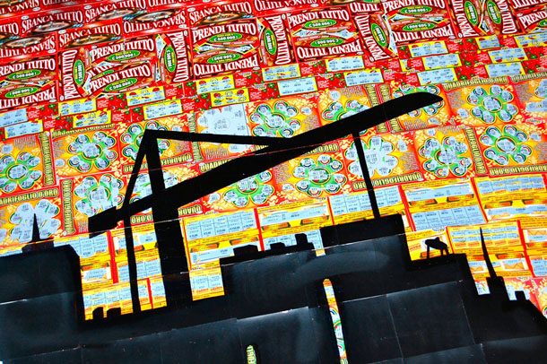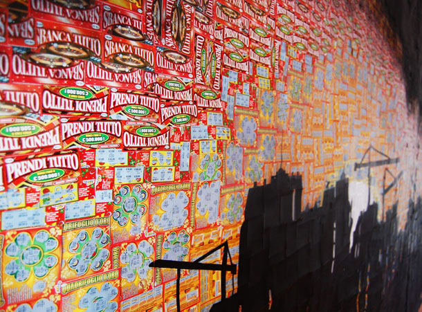 Si chiama “Cala La Notte” l’ultimo interessante progetto ideato da GEC, l’artista italiano ha impiegato ben 6 mesi durante i quali attraverso l’utilizzo di internet, ha raccolto 12.000 Gratta&Vinci usati. All’interno dell’idea sono stati coinvolte tabaccherie e singoli individui in una raccolta certosina su tutto il territorio italiano al fine di reperire i materiali per la creazione di una gigantesca installazione di 6×3 metri.