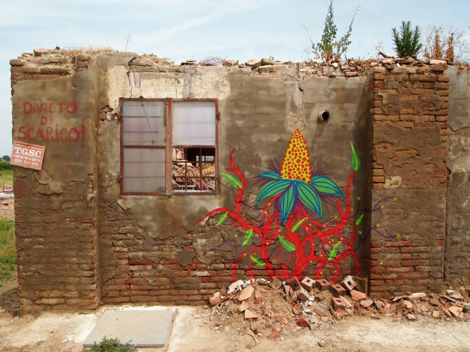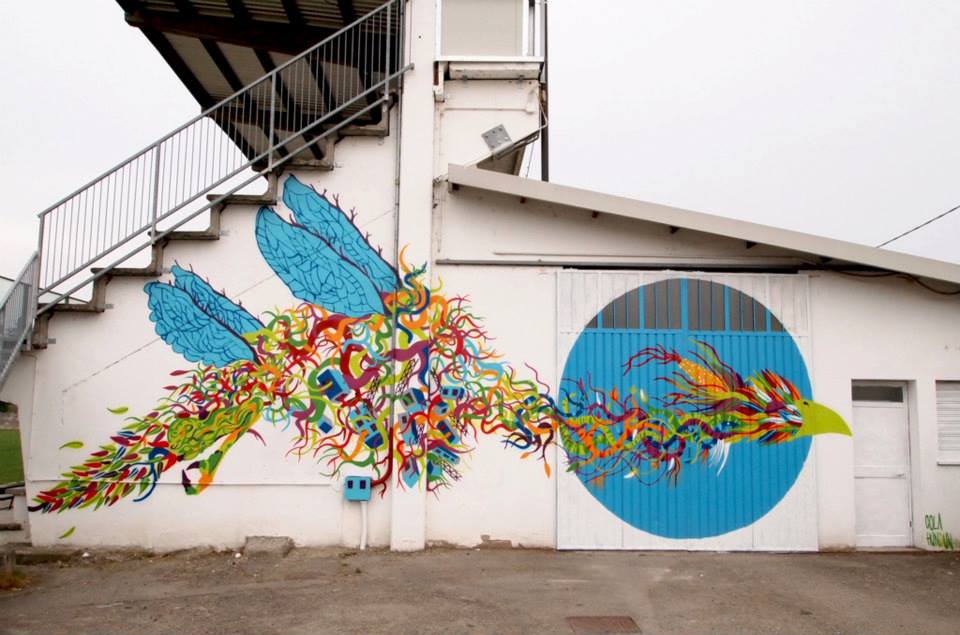 Gola Hundun non si limita a dipingere ma vuole piuttosto imprimere nelle pareti, nelle menti delle persone l’importanza del ricominciare, dell’andare avanti, l’artista italiano si esprime attraverso una forte connotazione grafica, sono i colori, tanti, diversi che slanciano ed elevano i suoi dipinti, enormi ramificazioni si fanno strada aprendosi ed espandendosi tra le viscere della facciata, è uno vero e proprio sbocciare di dettagli che nel loro insieme formano una possente figura di un uccello intento a spiccare il volo. Non solo l’interprete decide di istaurare un proprio e personale dialogo addentrandosi all’interno del costruzioni pericolanti, dei relitti di architetture e casupole spazzate via un anno fa, qui lascia il suo segno, indelebile, forte e ridondante, un segno che sa di io c’ero, io ho visto.