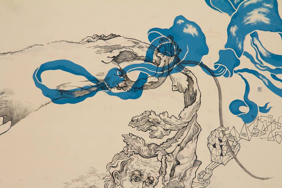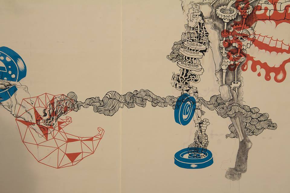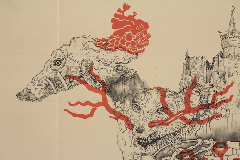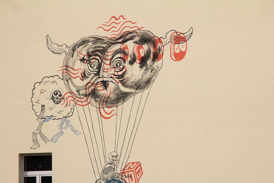 C’è molto da guardare in effetti, Gregor realizza quello che sembra un pezzo a metà tra il gioco di un bambino è il parto di un sogno distorto, quasi come una favola raccapricciante notiamo il volto di demone che accompagna la salita della mongolfiera come anche – e qui il pezzo forte – il grande animale a cui l’artista decide di affidare la propria opera. La belva è dotata di più volti come anche di diversissimi spunti da poter cogliere che riassumono in parte le influenze e le tematiche del lavoro dell’interprete, troviamo stimoli naturali con la pittura di piante e foglie come anche una certa influenza industriale che si nota attraverso la sequenza di ingranaggi che costituisce uno degli arti dell’animale, passando poi per gli esperimenti geometrici con gli interessanti intervalli di forme più organiche e concludendo con la grande costruzione architettonica che trova posto sul dorso dell’animale. Infine ad accentuare il forte carattere dell’opere Gregor inserisce una serie di dettagli cromatici che staccano letteralmente dal corpo centrale dell’opera finale, come se si trattasse di un livello superiore al dipinto stesso dal quale se ne allontano per stile, tratto e tematiche.