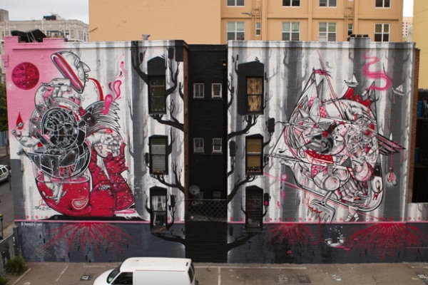 Il duo How & Nosm dopo la bellissima “Late Confessions“ organizzata dalla Jonathan LeVine Gallery nel proprio spazio Pop-Up, si sono spostati a San Francisco per lavorare ad una gigantesca facciata commissionata sempre dalla White Walls Gallery.