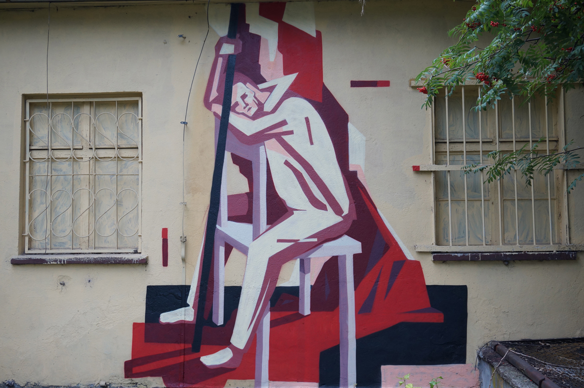 Completamente diverso da ciò che siamo soliti vedere sulle pareti in giro il mondo, Jacyndol porta avanti uno stile proprio che trova negli stimoli del cubismo con un dose di astrattismo a completare il quadro generale, la giusta linea di pittura, l’interprete si avvale di giochi di profondità, massimizza corpi umani e scenografie attraverso forme e figure geometriche, aumentandone l’efficacia grazie ad interessanti incursioni di colore che agiscono con lo scopo di accentuare le parti del corpo, emettere giochi di luci ed ombre ed fine da vere e proprie brillante scenografie, queste ultime non risultano piazzate li per riempire lo spazio ma piuttosto completare il quadro e la stilistica del lavoro offrendo interessanti esperimenti dimensionali veri e propri strizzando l’occhio alle correnti russe dei primi del novecento. Jacyndol si muove in questo immaginario raffigurando corpi quadrati, esseri statici e legnosi a contrasto con figure più complesse e ricercate ed in parte più morbide, l’artista sembra voler raffigurare figure spente a contrasto con uomini di personalità ed ancora proponendo spaccati di vita quotidiana attraverso il proprio personale approccio visivo.