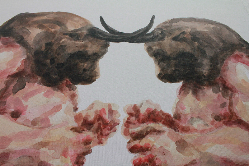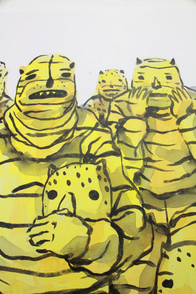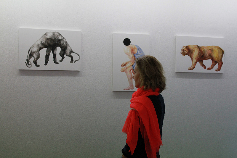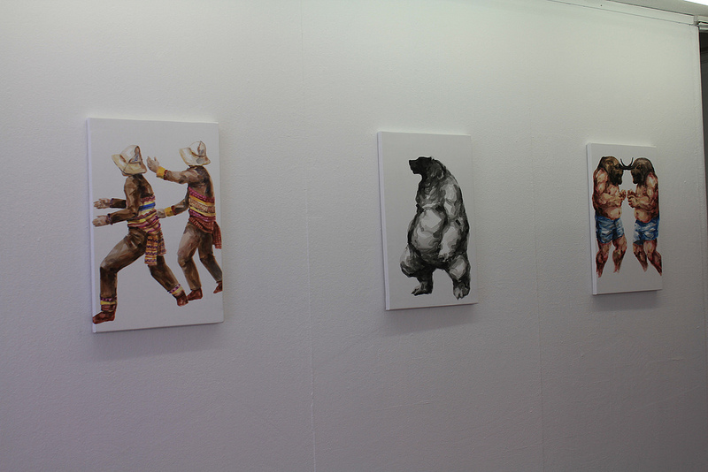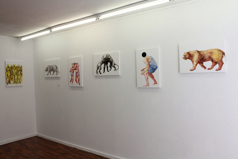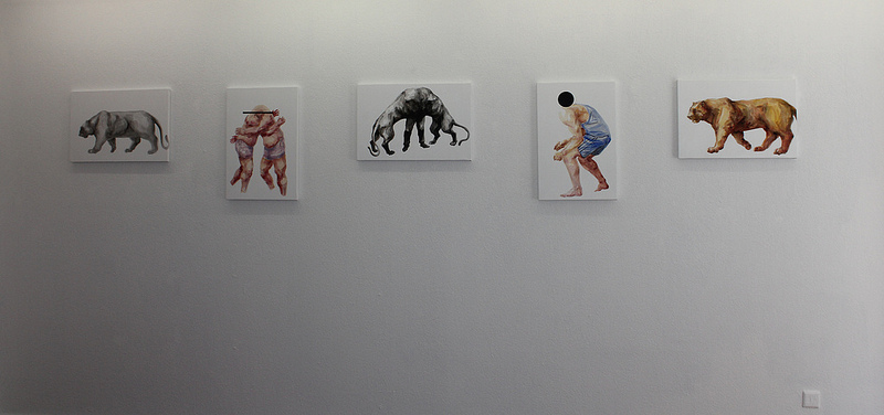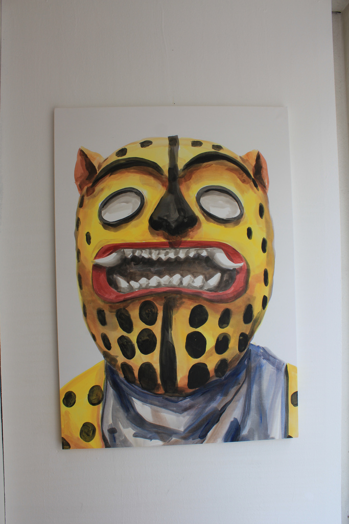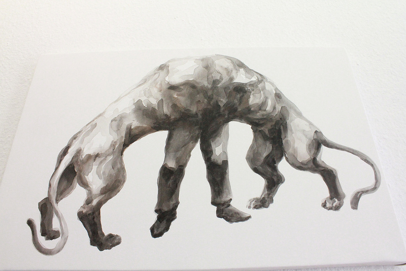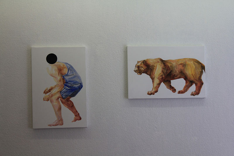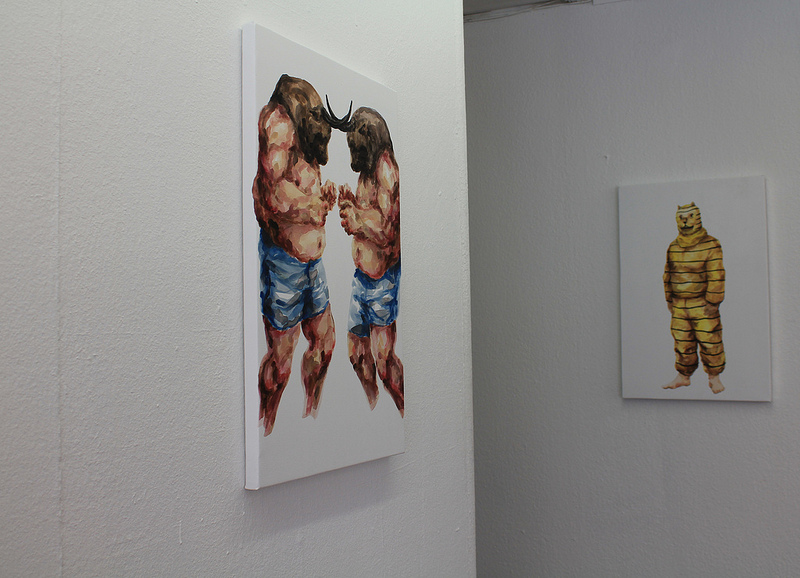 Ci serve tempo per metabolizzare, ci troviamo di fronte infatti a tutto il vasto repertorio che l’artista ama, ritroviamo le tanto care maschere con le quali l’artista aveva intercorso un dialogo negli scorsi anni, i lottatori, per poi passare all’attuale produzione con i consueti dipinti a specchio, i temi naturali e le immancabili fusioni corporee fino ad arrivare ai mash-up fisici tra uomo ed animali.