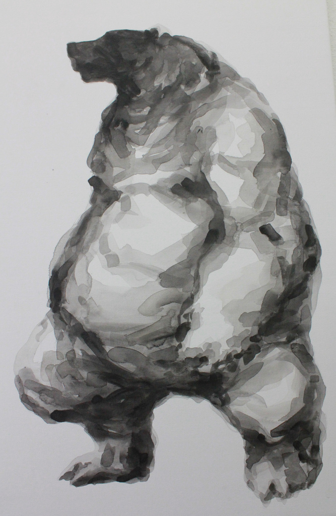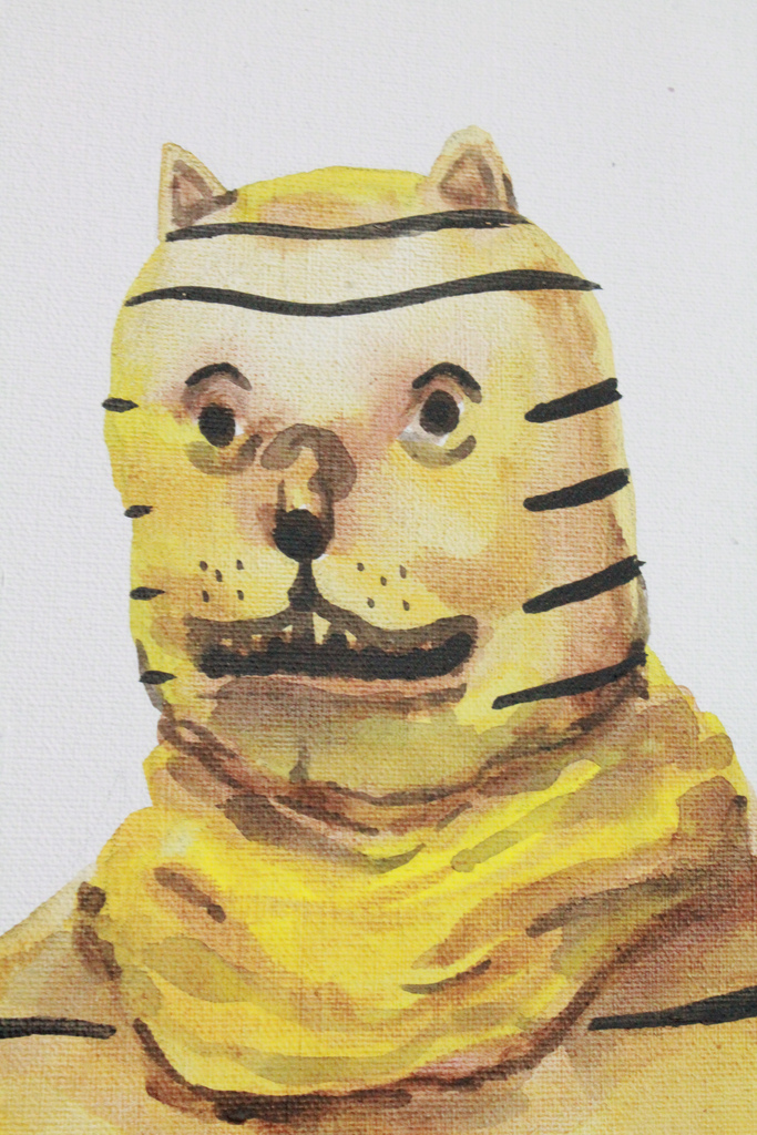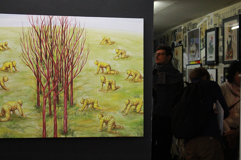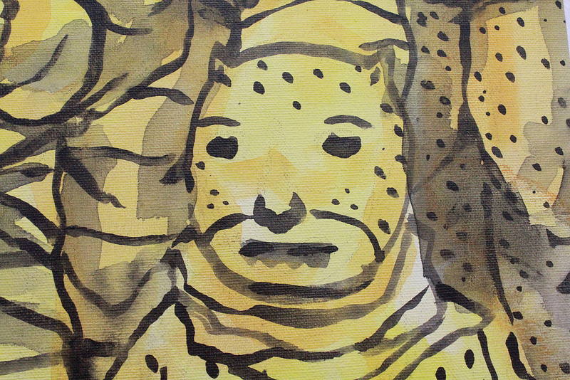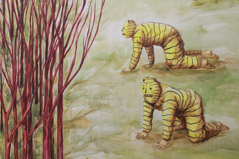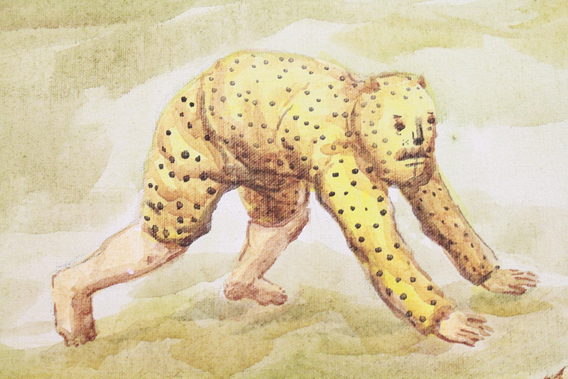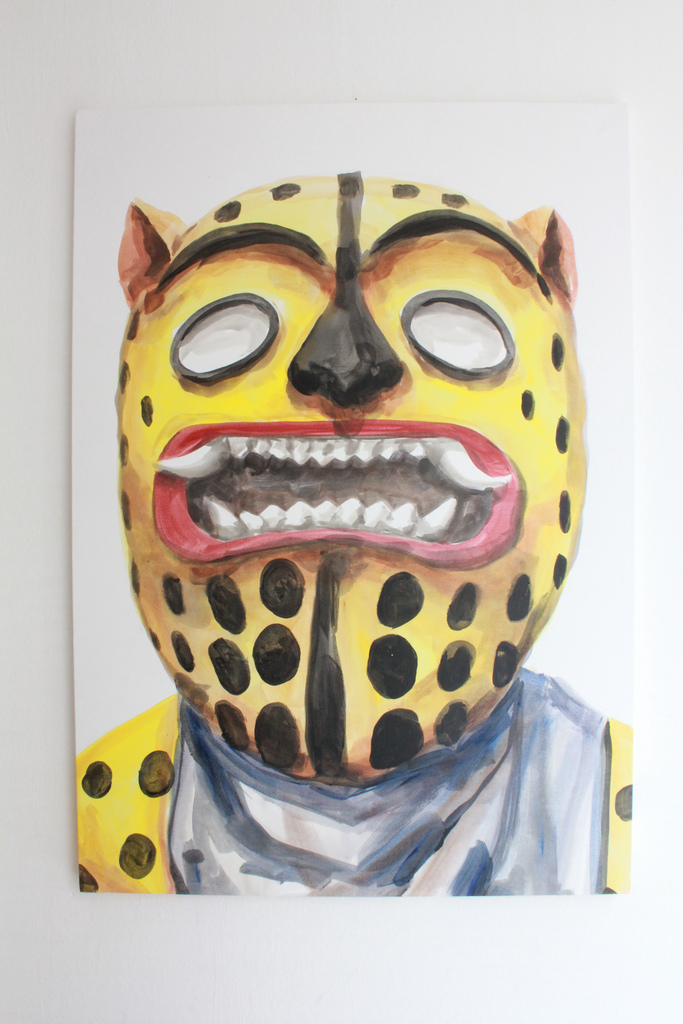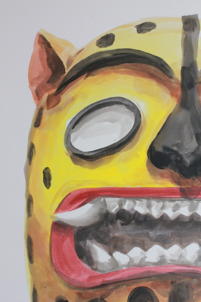 Ci serve tempo per metabolizzare, ci troviamo di fronte infatti a tutto il vasto repertorio che l’artista ama, ritroviamo le tanto care maschere con le quali l’artista aveva intercorso un dialogo negli scorsi anni, i lottatori, per poi passare all’attuale produzione con i consueti dipinti a specchio, i temi naturali e le immancabili fusioni corporee fino ad arrivare ai mash-up fisici tra uomo ed animali.