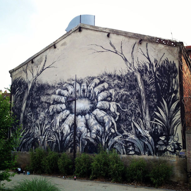 Ai più attenti non sarà sfuggito, JAZ per queste suo nuove opere prende direttamente spunto da quelli che sono i suoi lavori in studio, nella facciata Francese, va ad utilizzare unicamente colorazione in bianco e nero per dipingere una grande savana con nella parte centrale una serie di animali in cerchio letteralmente senza testa, per il lavoro in Belgio l’interprete invece torna a proporre un corpo umano unificato con due bestie nelle sue due estremità. Per entrambe le realizzazioni il livello di dettaglio è elevatissimo e come sempre JAZ va ad interfacciarsi con la parete attraverso pitture non convenzionali come vernici asfaltiche e petrolifiche.