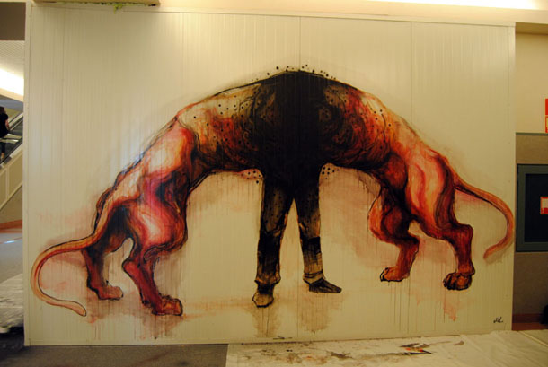 Franco Fasoli aka JAZ sà sempre come lasciarci di stucco, continua il suo lavoro studio dei corpi, sia animali che umani, in interessanti fusioni organiche. Dopo lo splendido lavoro dipinto insieme al nostro Moneyless in quel di Berlino (qui), l’artista si è spostato prima in Francia a Vitry per poi dirigersi ad Antwerp in Belgio per rispettivamente coprire un muro esterno ed un altro interno.