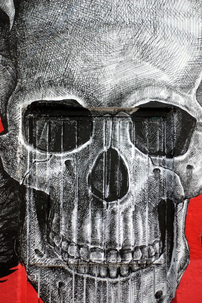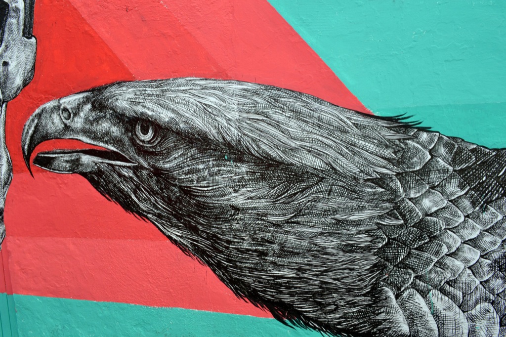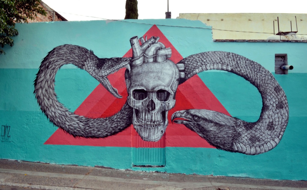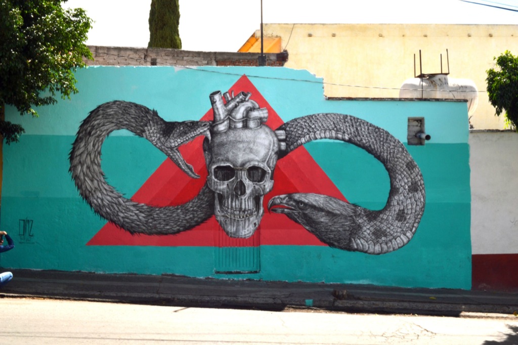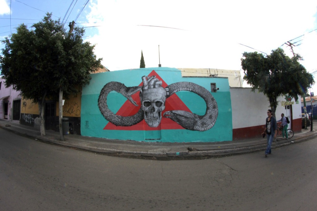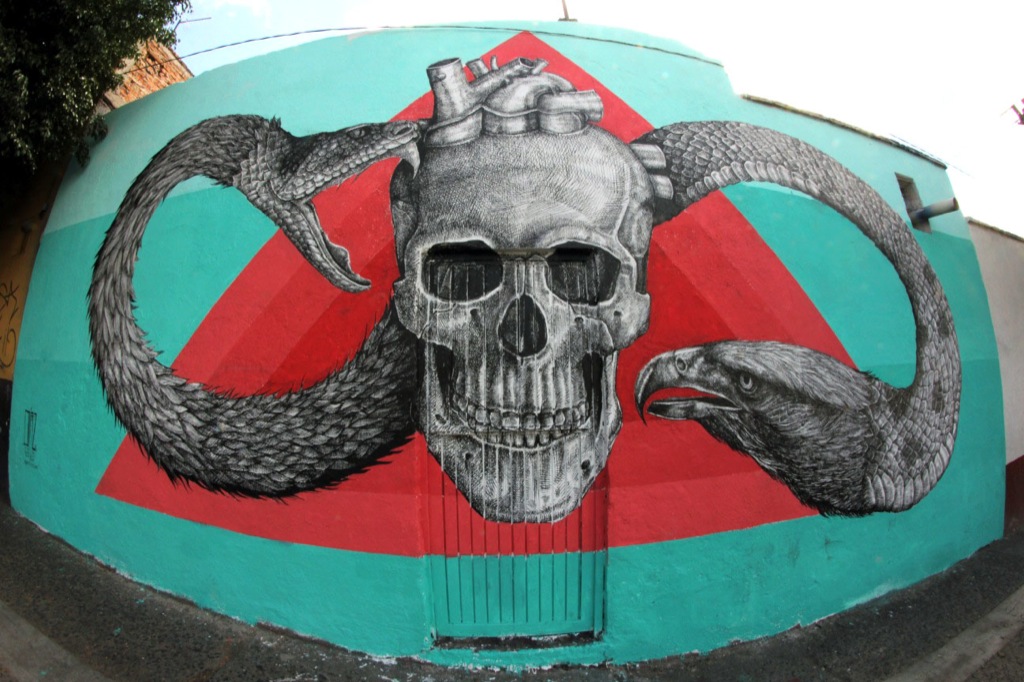 Alexis Diaz per la rassegna optà per una nuova fusione corporea, nel centro a mò di cuore pulsante pone uno splendido teschio con tanto di ventricoli disegnati sulla fronte, tutt’intorno sviluppa una improbabile fusione che vede uniti sotto lo stesso corpo un aquila ed un serpente, le teste scambiate come anche i rispetti tratti della pelle, piume corte per il primo, squamosa e ruvida per il secondo. A completare il risultato finale un background fortemente geometrico con una serie di triangoli rossi di varie tonalità, splendido.