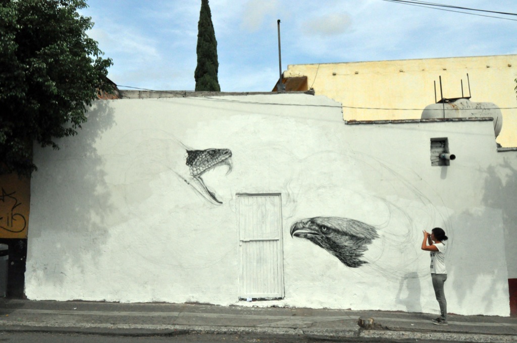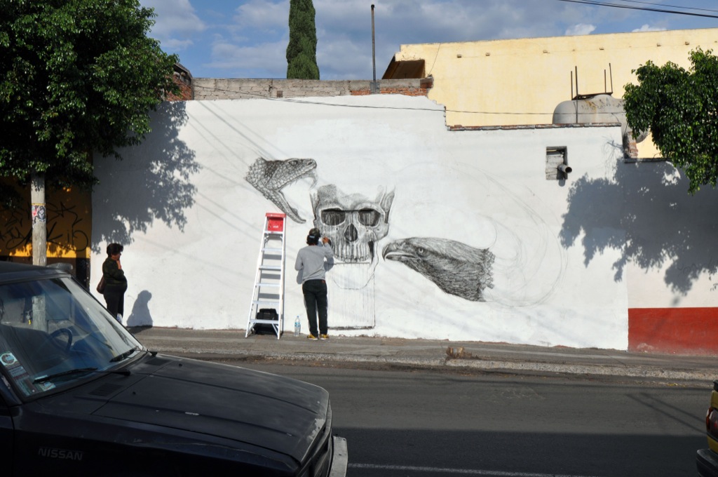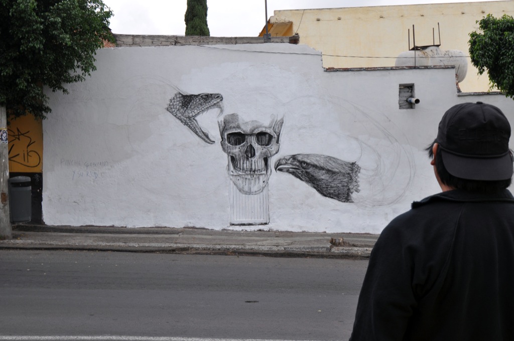 Continua senza sosta la programmazione dell’interessantissimo BoardDripper Festival di Querétaro in Messico, la rassegna sta offrendo un bello spaccato di quelli che sono i maggiori interpreti dell’aerea centro e sud americana, ultimo in ordine di tempo Alexis Diaz sempre più impegnato a portare avanti il nome de La Pandilla. Il grande artista infatti a differenza del socio Juan Fernandez, di lui non sentiamo parlare da parecchio, prosegue le sue sperimentazioni portando comunque avanti le tematiche visive proseguendo su uno stile raffinato ed assolutamente impegnativo. Quello che infatti appare immediatamente chiaro osservano le creazioni de La Pandilla è il grande lavoro che c’è alle spalle di ogni singola parete, la tecnica utilizzata, una pittura portata avanti unicamente attraverso l’ausilio di piccoli pennelli, conferisce al lavoro un carattere deciso ed una profondità e ricchezza di dettagli pazzesca che si vanno ad amalgamare con le particolari scelte cromatiche, gli interessanti giochi geometrici alle spalle della figura protagonista, e soprattutto con delle tematiche di mash-up intense e sempre molto elaborate che ne distinguono i lavori.