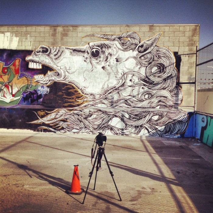 Since I got in LA I was craving to paint a big fat wall. I finally got the chance to do it in this amazing spot in Downtown, and I got to say I could’t ask for more. My dear Bucefalo was already waiting for me underneath the bricks. Go and say ciao, he’s waiting for you too at Depict.