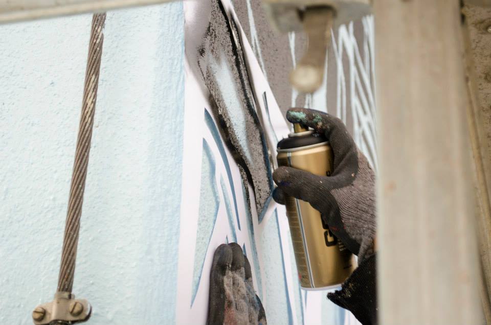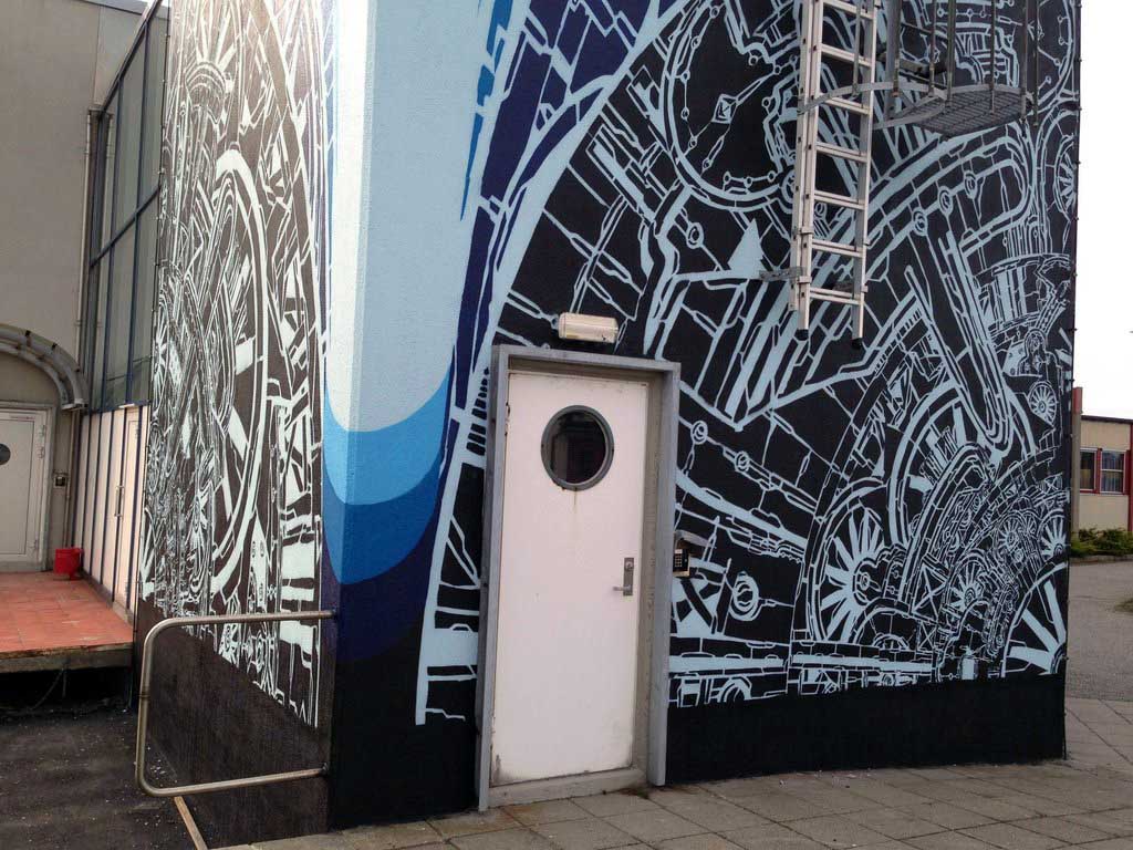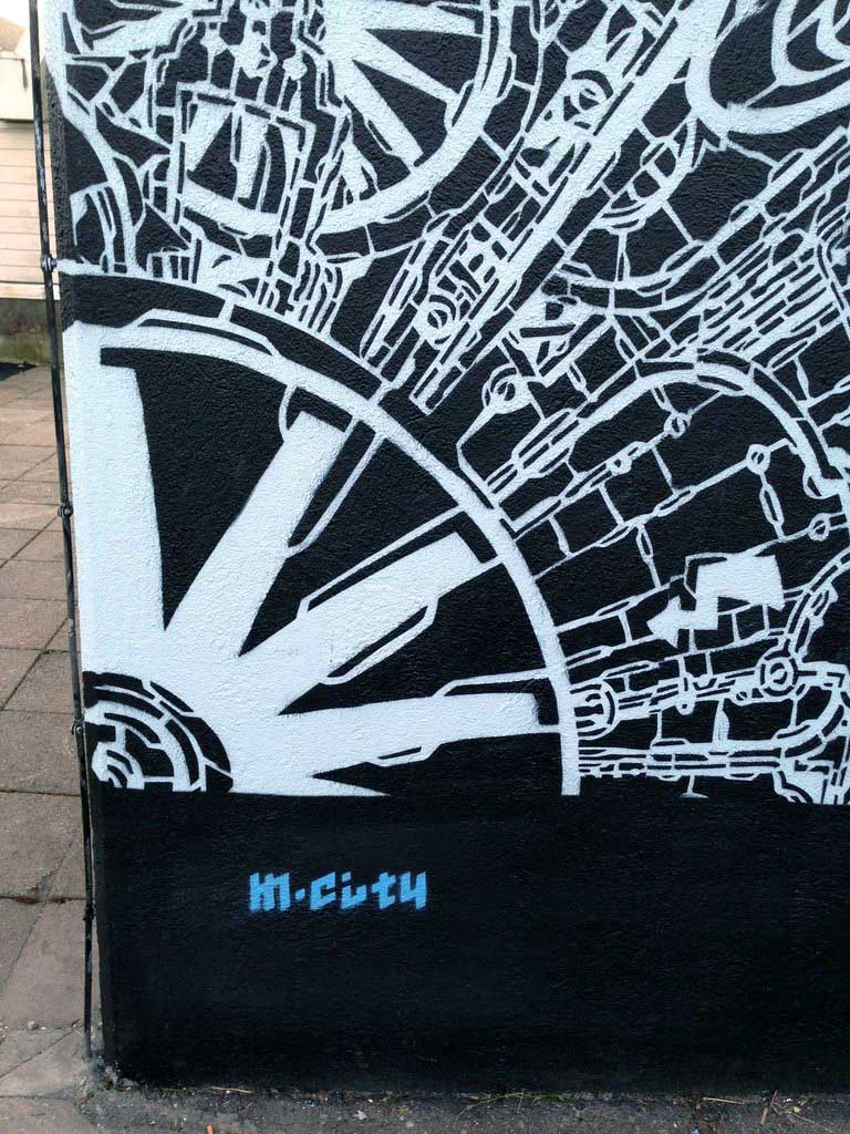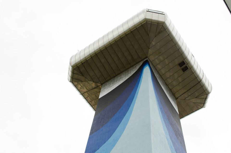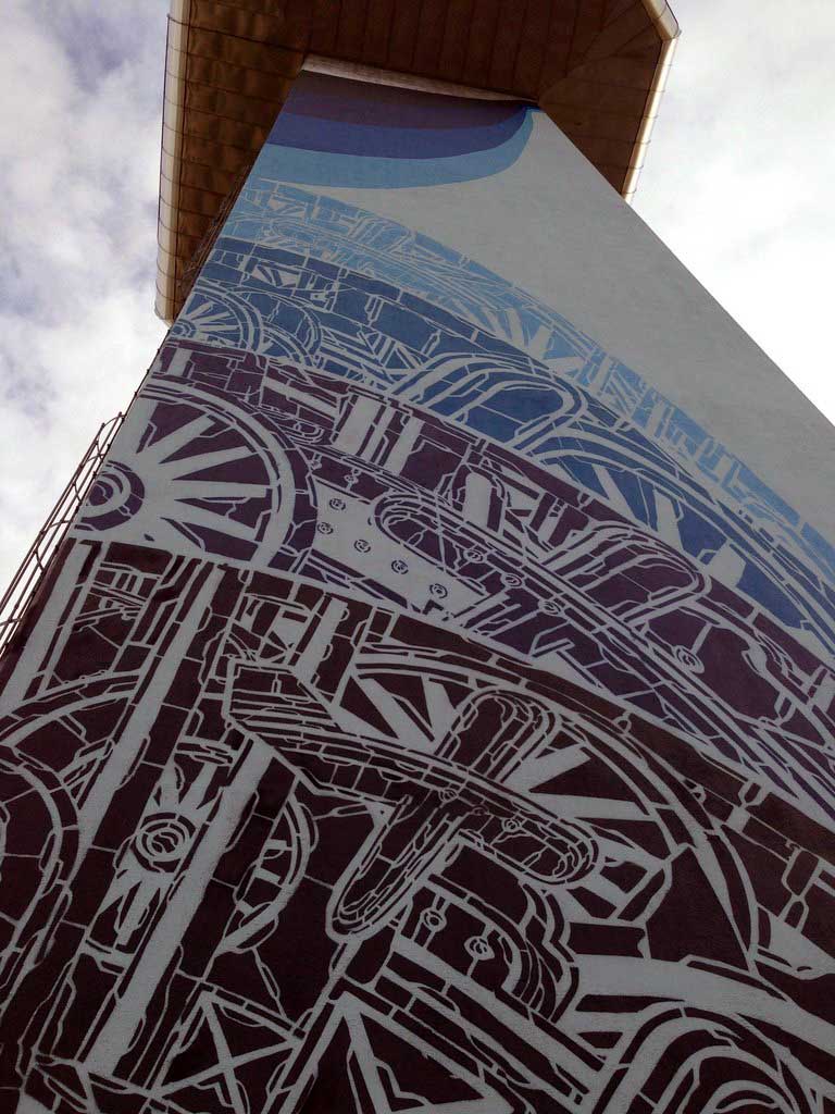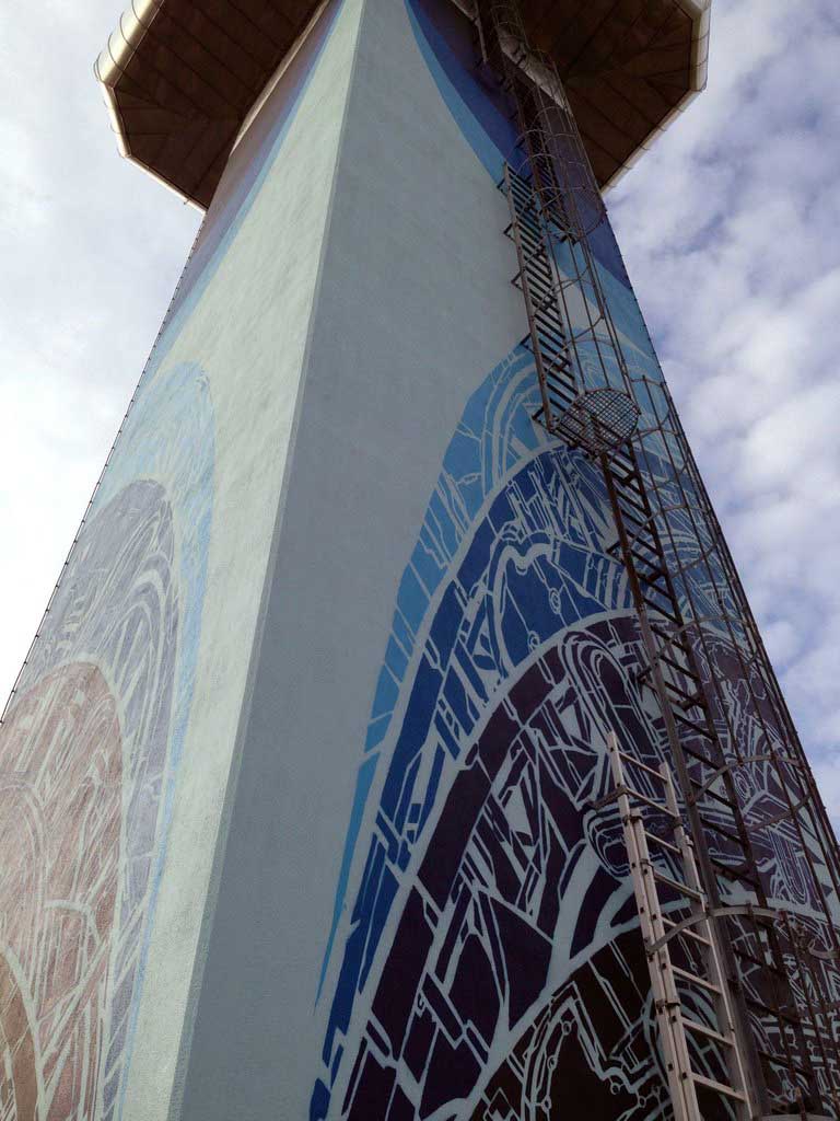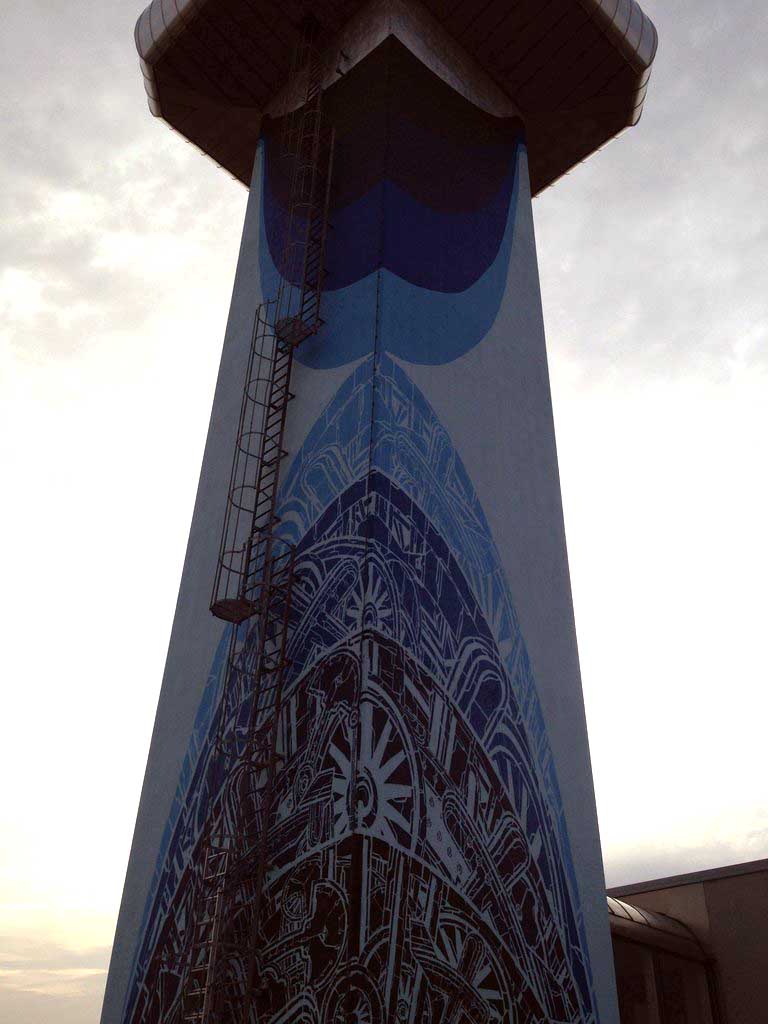 L’interprete approfitta della spazio realizzando una bella colorazione, grandi semicerchi che si aprono su ogni facciata della torretta, nella parte più bassa si ripetono nel verso opposto offrendo la base per il ramificarsi delle configurazioni e delle forme proposte. Si ha l’impressione di un ipotetico botta e risposta incentrato sull’evoluzione del blu fino al celeste ed al bianco stesso della superficie, qui M-City non si risparmia andando ad occupare i colori con un serie di forme, grandi ingranaggi e paesaggi urbani quindi si muovono sulla parti più basse delle pareti regalandoci ancora una volto una opere decisamente dettagliata e, nel suo risultato finale, assolutamente riuscita.