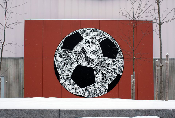 Recentemente M-City si è diretto ad Oslo in Norvegia, qui, sfidando le temperature, si è occupato di creare questo grande pallone da calcio, all’interno della sfera una serie dei suoi canonici edifici alternati in colorazioni di bianco e nero per ricreare l’effetto delle classiche toppe del pallone da calcio.