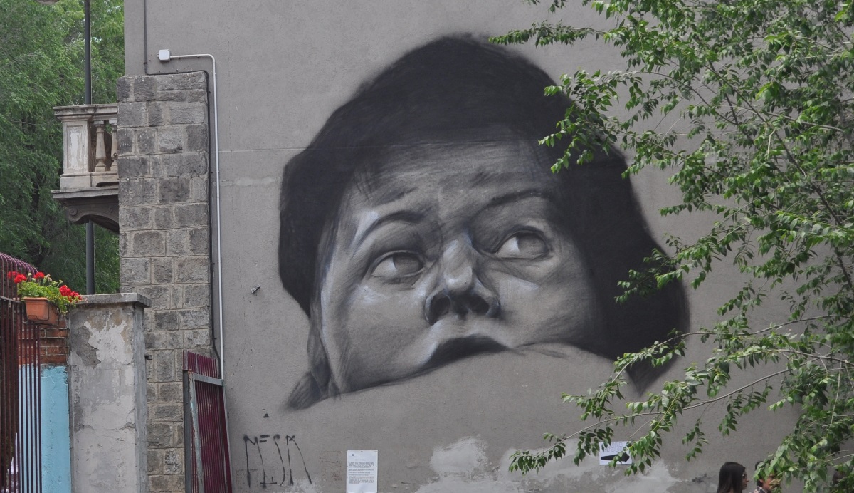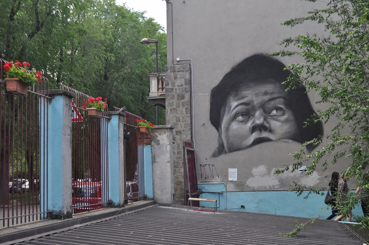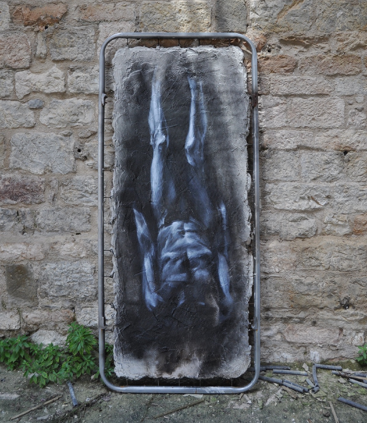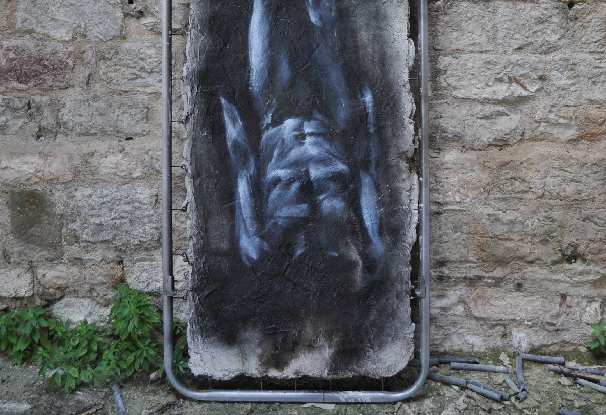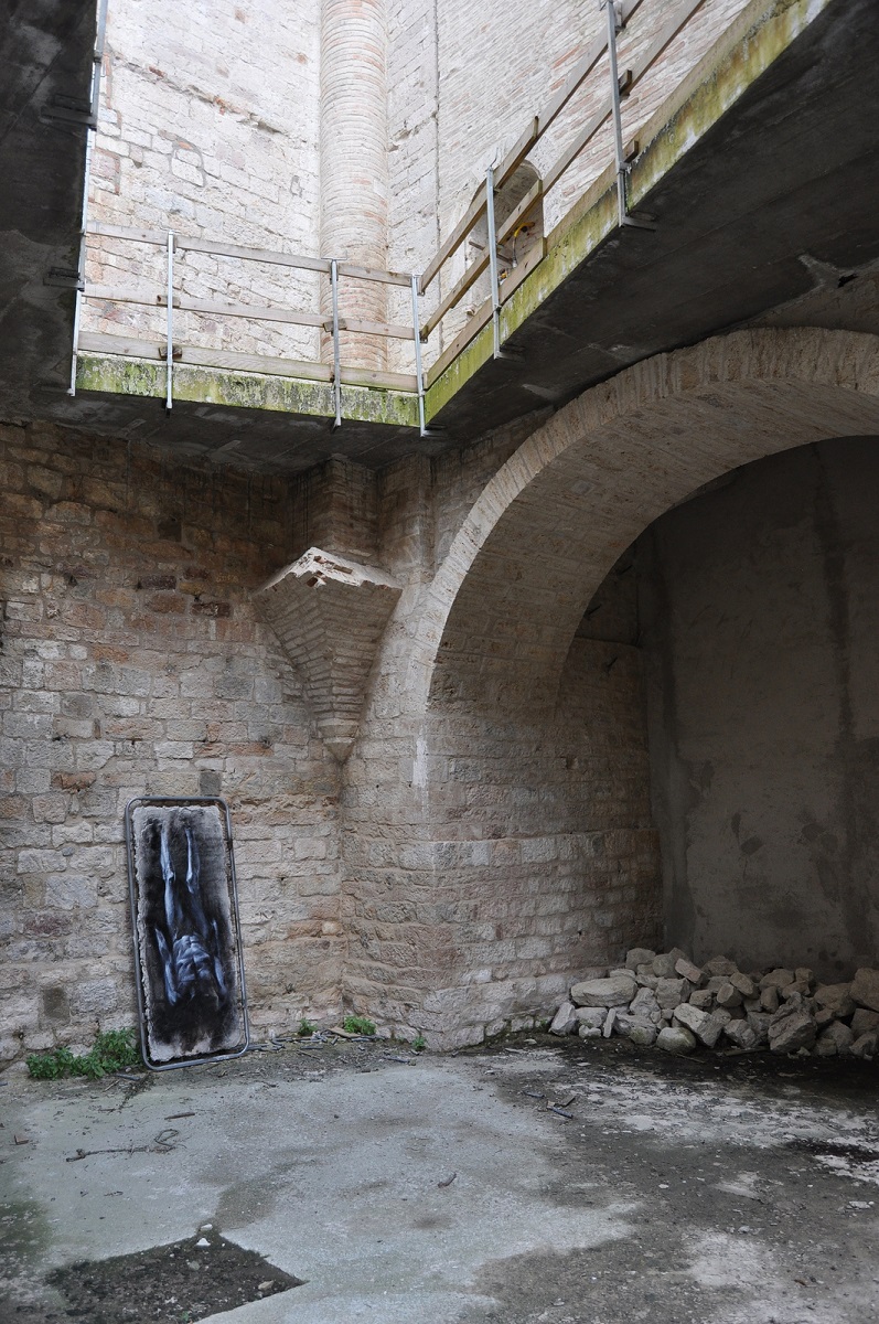 La prima opera si perde all’interno di questa porzione di parete, Mesa qui concentra i suoi sforzi nella realizzazione di un volto di una bambina, lascia scoperta la bocca, concentrandosi piuttosto sullo sguardo perso che traspare dagli occhi, la seconda realizzazione è forse quella che ci ha maggiormente impressionato, siamo all’interno di una Chiesa di San Francesco a Perugia distrutta nel terremoto del 1997, qui, nascosto questa antica cappella, l’artista trova un vecchio letto bruciato di cemento dove decide di apporre la propria firma, prende così vita il corpo di un uomo straziato e semi nudo, la figura emerge dal nero come uno spettro che si aleggia sul posto, intenso, ricco ed assolutamente d’effetto.