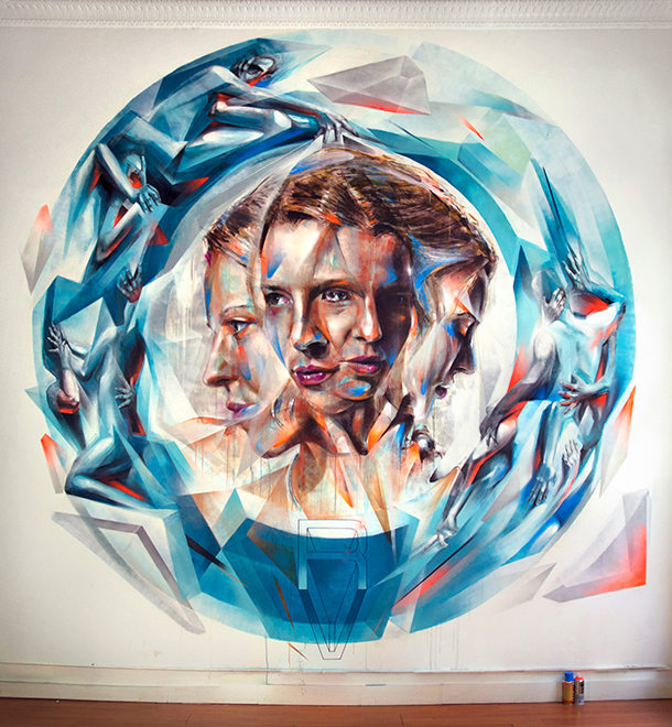 Il Konsequenz Graffiti Shop, punto di riferimento di chiunque dipinga in città, non poteva adottare scelta migliore, affidando ad i due la propria facciata interna. Il risultato è un emozionante e camaleontico lavoro incentrato sulle riflessioni futuriste che vediamo qui sviluppate a quattro mani in un composizione dove al centro troviamo la figura della donna, la osserviamo attraverso gli occhi diversi dei due artisti, volti e corpi si mischiano con l’astrazione geometrica.