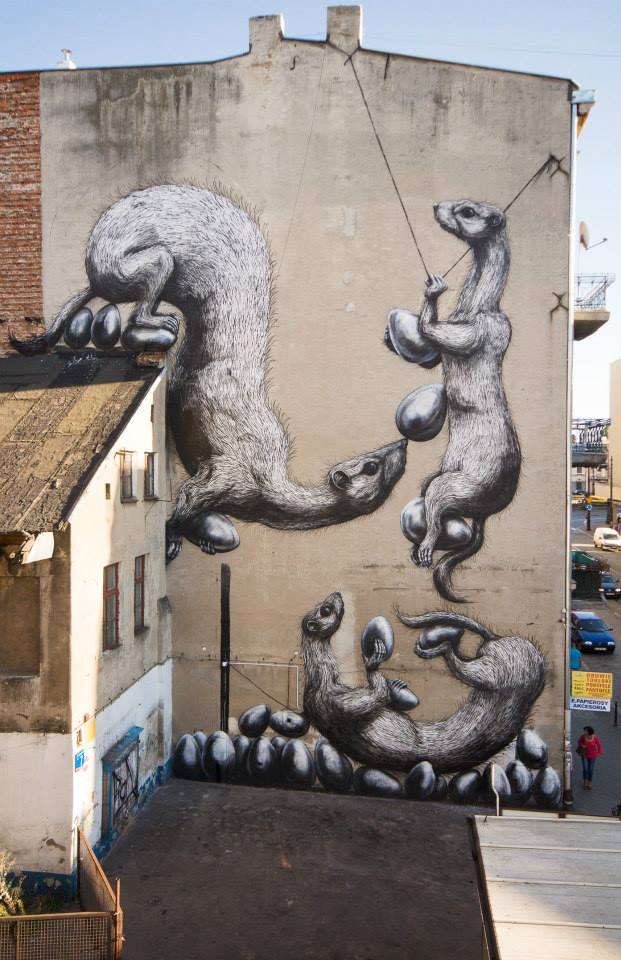 Il grobetrotter belga approda così a Lodz con tutto il carico di stile che ne distingue le opere, dopo gli interessanti esperimenti, ultimo al NUART Festival di quest’anno, ROA riprendere il personale filo del discorso proponendo la propria visione di alcuni roditori intenti a giocare con una serie di uova. Utilizzando le canoniche tonalità grige, l’artista concentra i propri sforzi come sempre sui dettagli relativi al pelo ed alle uova in questo caso, gli incredibili effetti di luce uniti alla propensione al dettaglio dell’artista donano all’opera ancora una volta una realisticità incredibile.