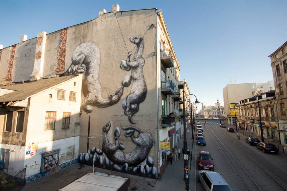 Probabilmente uno dei luoghi più interessanti per chi mastica ed ama l’arte urbana, sia per la quantità ma soprattutto per la qualità delle pareti dipinte, di qui sono passati tra i migliori al mondo, lasciando il proprio tangibile segno, il proprio tratto, su grandi muri a disposizione. La Galeria Urban Forms di Lodz in Polonia ha anche mostrato come sia possibile organizzare ed allestire grandi musei a cielo aperto riuscendo a portare ed far esplodere il movimento in un nazione in crescita come quella Polacca ed in generale su tutto l’est Europeo. Ci siamo occupati del fenomeno attraverso il nostro Reflections all’interno del quale potete leggere cosa ne pensiamo, ora però è arrivato il momento di dare il benvenuto ad un altro big della scena che poggia le sue mani sui muri della città per la prima volta, con ROA prosegue il costante mutare del progetto che anno dopo anno sta mostrando gli sviluppi di una politica di arricchimento artistico votato alla rigenerazione urbana, il cemento grigio combattuto con il colore, più semplice di così.