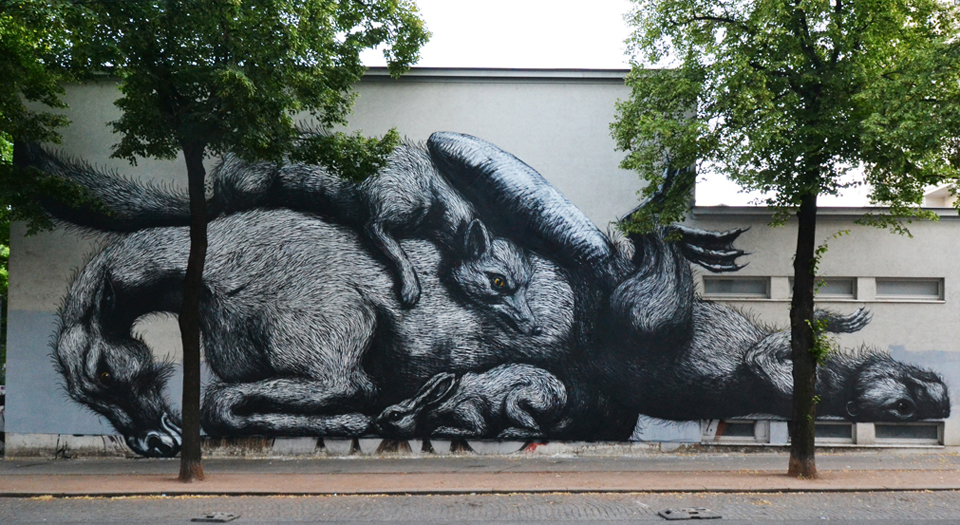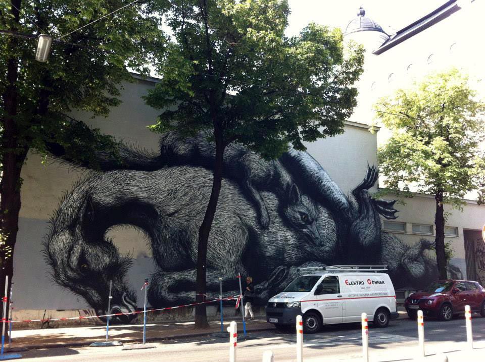 Nella capitale austriaca il grande artista belga fà sfoggio di tutta la sua immensa classe dimostrando ancora una volta come più è presente il contatto diretto con la gente, i passanti o curiosi, più i suoi lavori inondando la strada di tutta la loro forza, in questo caso i fortunati abitati hanno l’opportunità di ammirare davvero da vicino l’ultima meraviglia firmata ROA che qui ha lavorato sul muro direttamente adiacente al marciapiede, sontuoso.