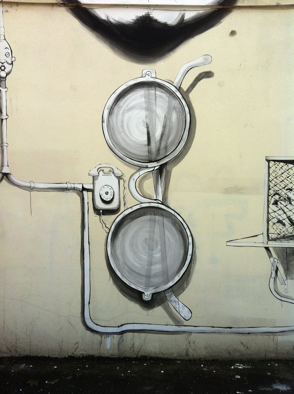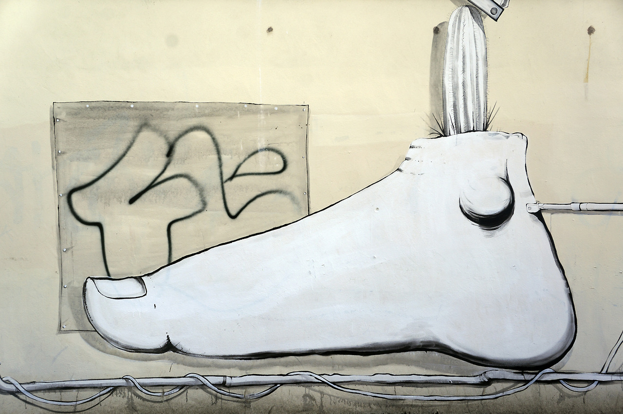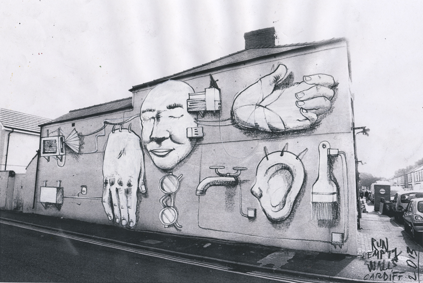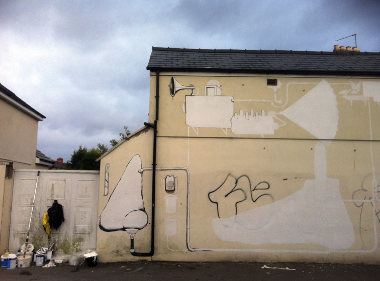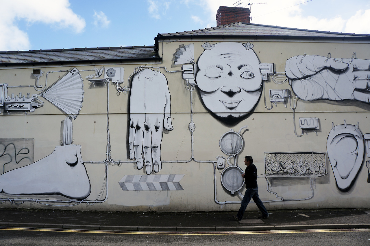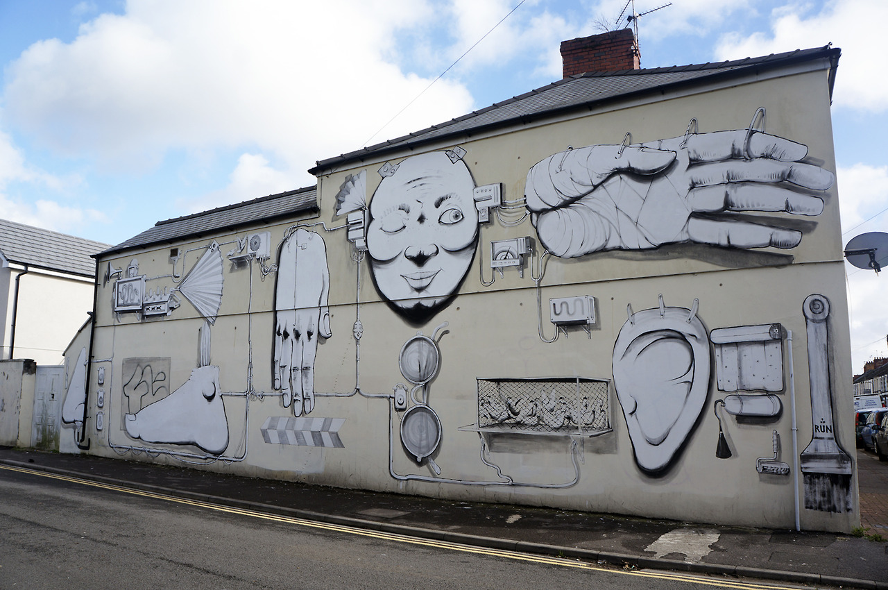 Abbiamo sempre apprezzato la poetica dei lavori di RUN, l’artista italiano da anni al lavoro in quel di Londra, nel corso del tempo ha portato avanti un approccio visivo molto personale, lo studio dell’uomo ed in particolare dei corpi per passare poi ad un analisi più approfondita dei volti e delle mani ne hanno da sempre caratterizzato l’operato elevando la sua ricerca tra le più interessanti del panorama, ora assistiamo con piacere ad un nuovo personale step. Facendo eco alla precedente opera di Londra, RUN per la parete a disposizione per la rassegna gallese piuttosto che soffermarsi su una riproduzione ciclica di porzioni e parti di corpo dona una vera e proprio scenografia alle stesse andandole ad inserire all’interno di un contesto ben ramificato e ricco di spunti. Il grande interprete sviscera così sulla parete una serie di parti umane, come un piedi, le mani, un naso ed un orecchio ed ovviamente l’immancabile volto che va ad unirsi ad una serie di oggetti e dettagli come l’apparecchio telefonico, un paio di occhiali, passando per la gabbia di galline, uno dei suoi canonici ventagli ed infine i suoi stessi strumenti di lavoro e molto, molto altro. La differenza con gli altri interventi sono i collegamenti che l’artista innesta tra una sezione e l’altra visti dall’interprete sotto forma di veri e propri cavi elettrici che corrono lungo lo spazio a disposizione collegando ogni parte con un’altra, si ha così la sensazione di un piccolo racconto, emerge difatti una storia vera e propria che l’artista sembra volerci raccontare, non solo si ha il sentore di un vero e proprio riassunto di vita, con i simboli personali disposti ed ordinati su un grande spazio che ispirano spunti e storie differenti unendosi ed intersecandosi sia con l’immaginario proprio di RUN ma anche con il nostro in un brillante e riuscitissimo risultato finale.