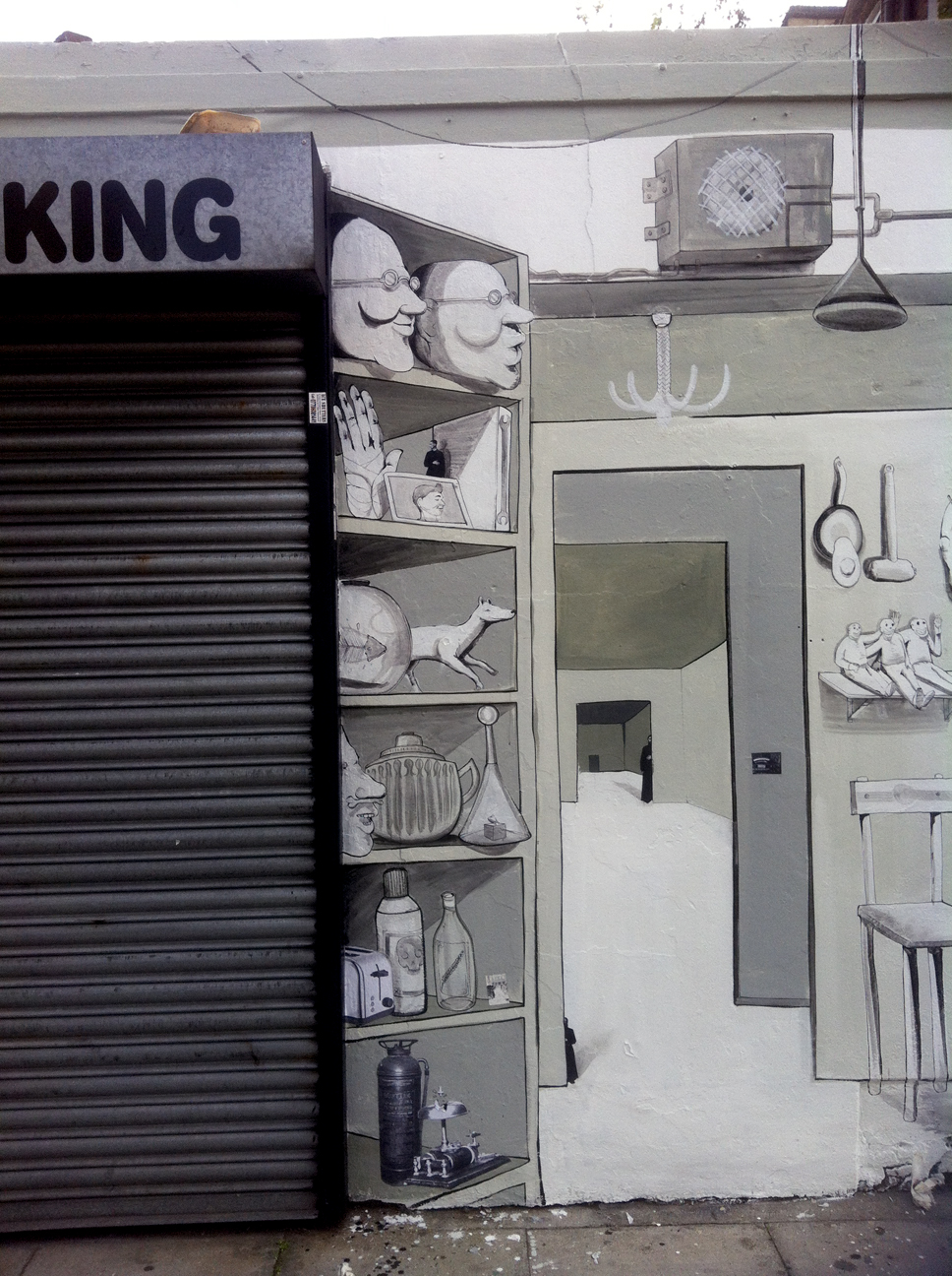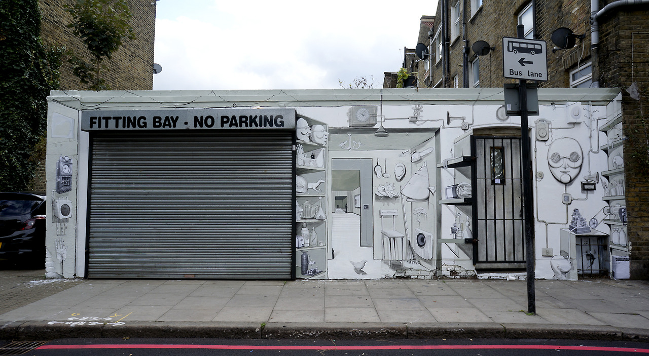 Ambedue ormai famosissimi per le strade Londinesi grazie ai rispettivi e facilmente riconoscibili stili, RUN grazie ad i suoi caratteristici volti e corpi alimentati da un immaginario unico che vediamo qui incontrare l’astuzia visiva e la sensibilità agli spazi di Pablo Delgado, le sue situazioni surreali vissute dai caratteristici personaggi vengono qui miscelate attraverso un lavoro dalla forte connotazione tridimensionale.