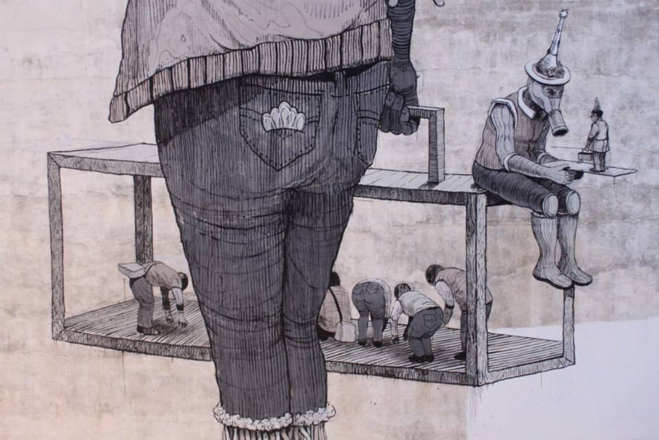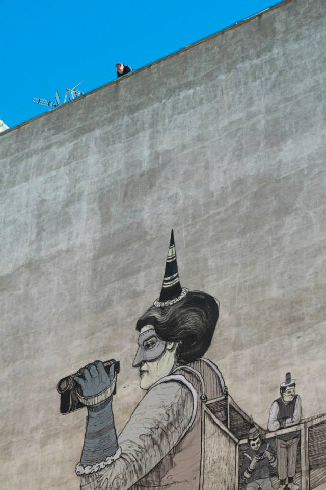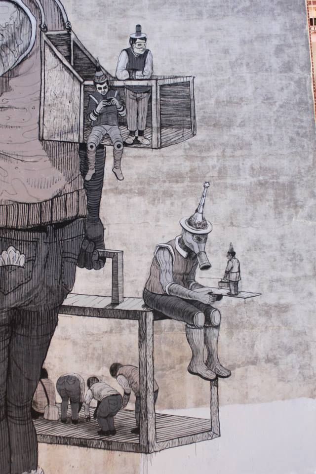 In quest’ultimo lavoro ancora una volta emerge tutta la spiccata efficacia del tratto pittorico dell’interprete, SAN non si limita a dipingere attraverso una semplice riproduzione fedele, piuttosto l’artista esibisce una tecnica incredibile coniugata attraverso una visione d’insieme che si fonde prepotentemente con tutto il paesaggio circostante, Daniel Munoz analizza gli scorci che ha di fronte, qui inserisce la sua caratteristica pittura in totale armonia con ciò che vede il tutto supportato dallo studio della particolare conformità della parete e dello spazio a disposizione che diventano così componenti fondamentali nel lavoro dell’interprete che ne ridisegna così completamente l’aspetto finale. Ancora più importante e caratteristico è il lavoro di profonda caratterizzazione che accompagna gli uomini e le donna che SAN realizza, i personaggi rappresentati risultano assolutamente bizzarri, attira l’attenzione per i particolari vestiti e per la serie sconfinata di dettagli e spunti che riescono ad offrire. Osservando però con maggiore impegno abbiamo la sensazione di trovarci di fronte ad un fortissima critica sui tempi moderni, un vero e proprio specchio incrinato dove gli eccessi vengono portati al limite, dove l’eccentrico ha preso il sopravvento ed attraverso il quale SAN ha l’opportunità di realizzare dei veri e propri spaccati di vita rivisti attraverso una chiave completamente nuova e peculiare.