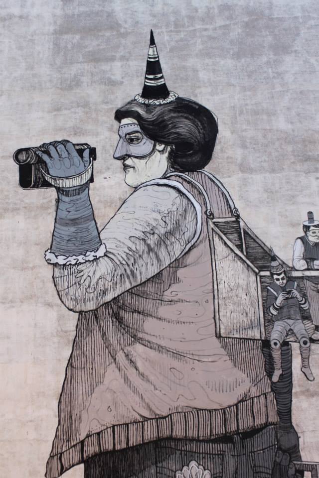 In quest’ultimo lavoro l’artista prosegue questo suo peculiare approccio, a fare capolino sulla grande parete a disposizione è una donna armata di telecamera ed intenta a riprendere il circondario, anche qui sono i dettagli a catturare la nostra attenzione, la signora porta con se, sia sulle spalle che pe, una valigia ed uno zaino di cui rimangono unicamente gli scheletri e dove all’interno troviamo accovacciate ed appollaiate una serie di persone.