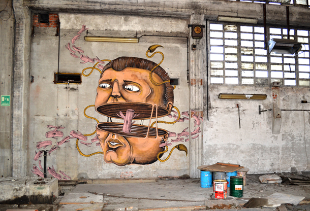 L’artista occupa in modo egregio la parete proponendo il volto di uno dei suoi canonici personaggi, il dipinto presenta una bella dissezione del viso concavo con all’interno una legna.