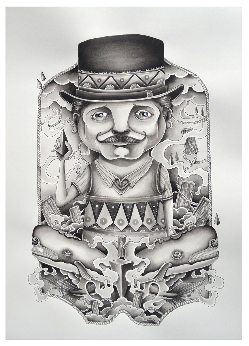 Dreams of Grey, a solo exhibition of SeaCreative, catapults us into a world in black and white but full of nuances: grotesque characters, halfway between dream and reality, seem to emerge directly from his mind and then hang on the paper as a coloured grey vision.