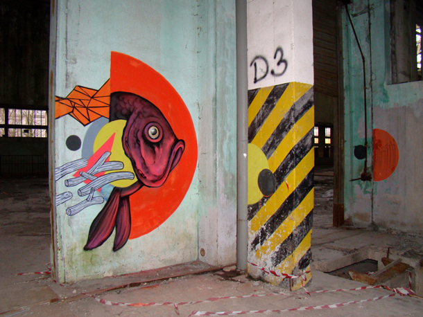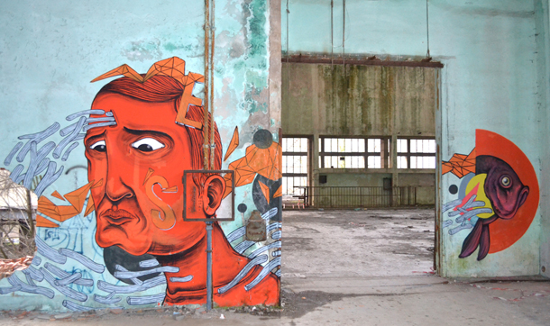 Il risultato finale è una composizione a tema marino decisamente in movimento, con tanto di interazione con lo spazio circostante come il buco nella parete. Il character del primo sembra immerso in acqua, circondato e letteralmente attraverso dalla flora marina che si sposta e ricongiunge con l’iper realistico pesce dipinto dal secondo, a completare il tutto alcuni dettagli astratti.