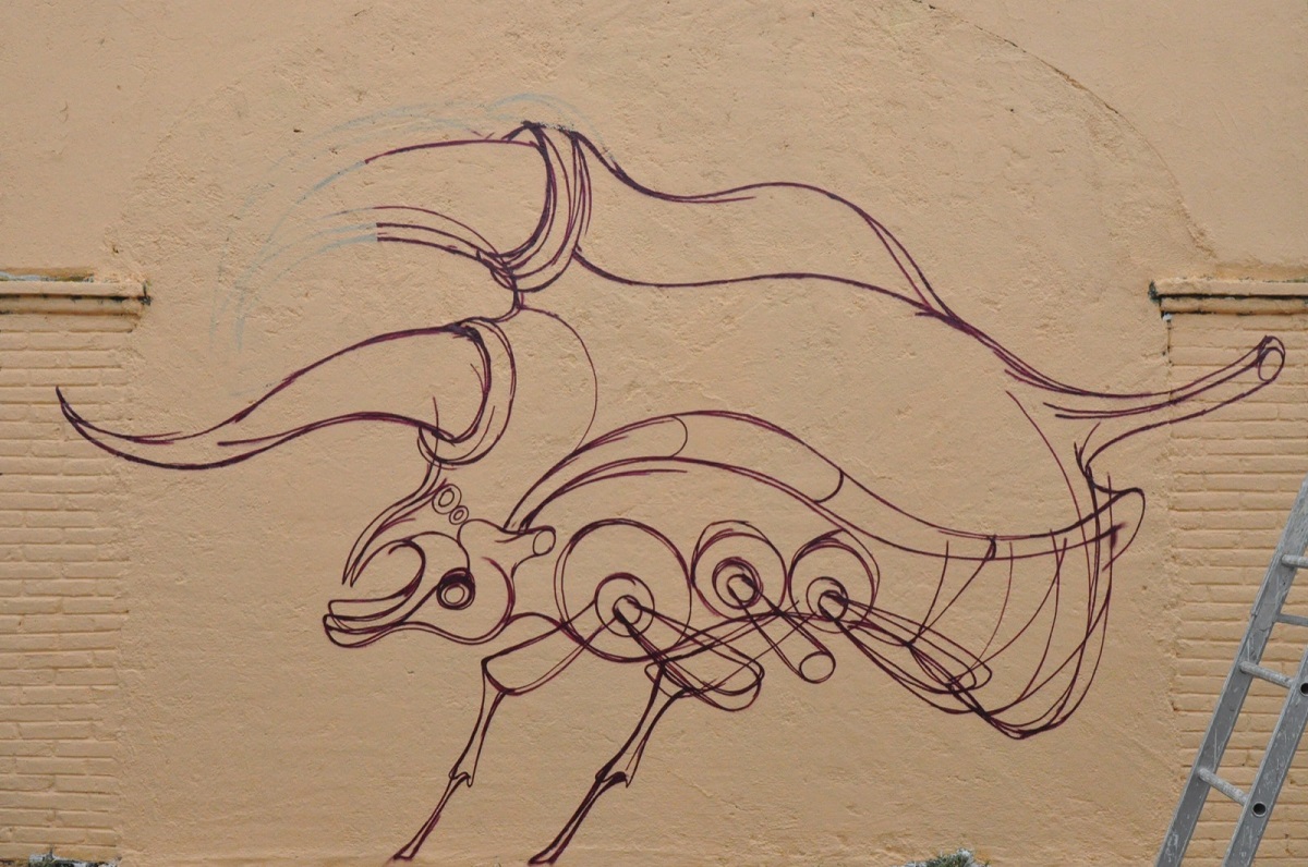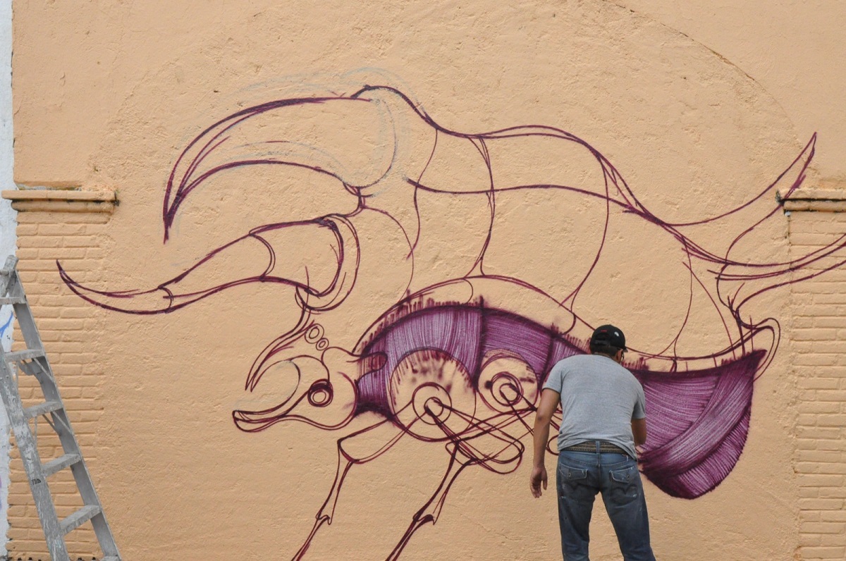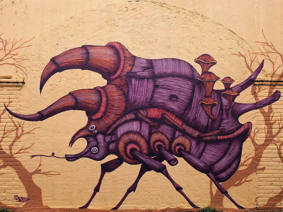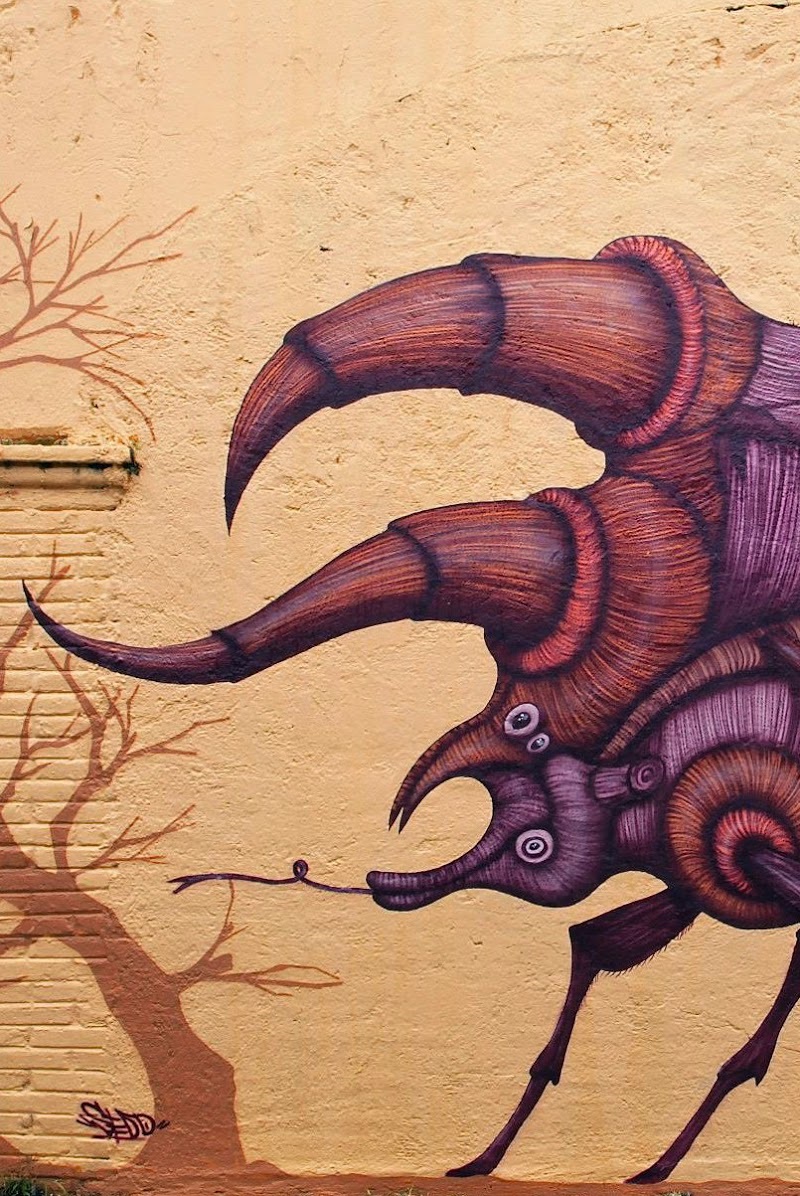 Non sentiamo spessissimo parlare di Sego, davvero un peccato perché l’artista Messicano incarna uno stile assolutamente personale e lo fa portando avanti la sua passione per la natura, nello specifico gli animali, unita con la pittura murale. La lente di Sego vede le bestie rappresentate attraverso fitti fasci di carne incanalati all’interno di grandi porzioni di colore, vengono composte con una serie di striature ad aumentarne il senso di vivo ed a proporne la profondità sia tematica che visiva. Sego ci affascina per la grande cura nel dettaglio e soprattutto per un immaginario che lo vede interagire profondamente con quello che lo circonda, nascono così belve bizzarre al limite dell’impossibile composta da più corpi uniti sotto la medesima fantasia, ed ancora attimi di natura che ne invadono pesantemente i corpi raccontandoci, portandola al limite una simbiosi nei suoi lavori.