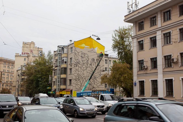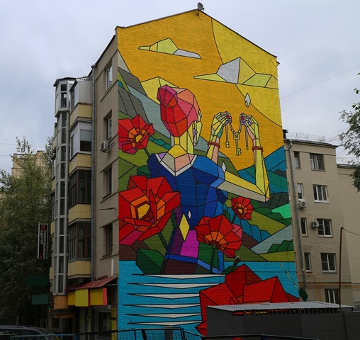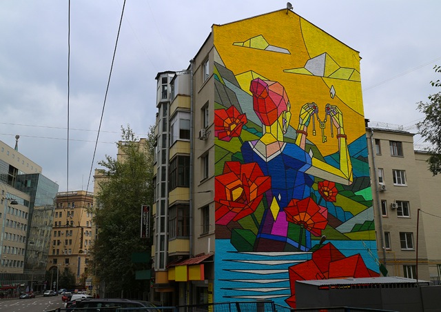 Tra le magie dei differenti festival dislocati qui e lì in giro per l’Europa, l’Est europeo ci sta regalando veramente infinite soddisfazioni grazie ad un brulicare di rassegne ed eventi di primissimo livello, tra questi senza dubbio troviamo l’LGZ Festival di Mosca che prosegue spedito la sua programmazione da circa un mese. L’ultimo in ordine di tempo a dipingere una delle grandi pareti a disposizione per la bella rassegna moscovita è Aske aka Sicksystems che approda nella capitale come unico, per il momento, artista a rappresentarne i colori nazionali. L’artista russo porta con se tutto il suo particolare approccio visivo figlio di un passato da graf artist e della successiva evoluzione stilistica divisa tra il lavoro di graphic designer, illustratore ed appunto street artist. Tornano quindi le forme e le geometrie che rappresentano il tratto distintivo di Sicksystems, i colori vengono declinati seguendo perfettamente le grandi caselle geometriche a cui è affidata la fisionomia del lavoro, sono saturi e decisamente accesi accompagnati da forti linee nere che ne delimitano la zona.