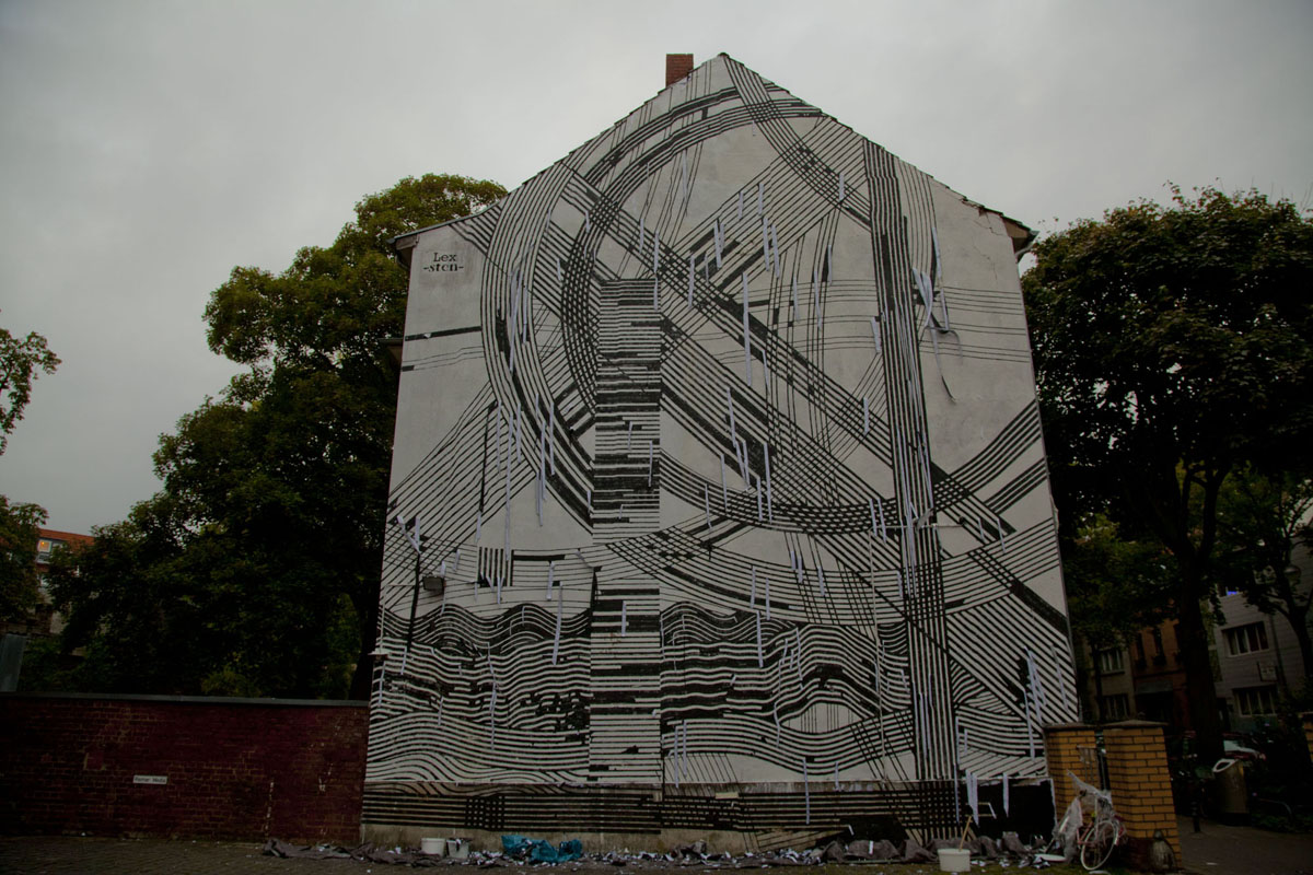 Sorpassando le elaborazioni precedenti Sten & Lex giungono ad un nuovo indirizzo astratto, per la rassegna tedesca a differenza delle precedenti opere basate su giochi di texture e pattern, qui assistiamo ad una vera a vere e proprie forme e motivi che prendono vita sullo spazio a disposizione, si ha l’impressione di vedere un dipinto emergere tra le onde delicate che si muovono nella parte inferiore oppure alla serie di cerchi nel corpo centrale passando ovviamente per i grandi assi che intersecano la spazio da un vertice all’altro, spettacolare