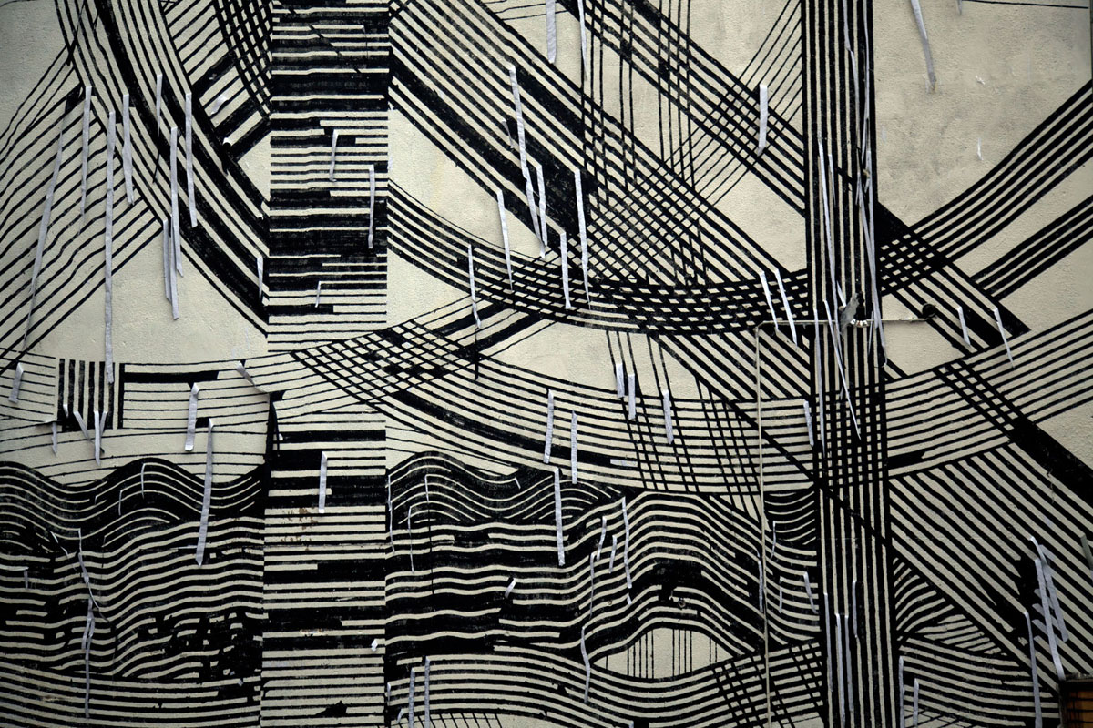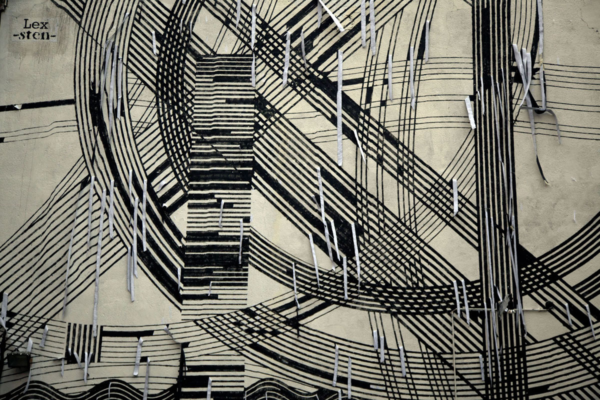 L’approccio astratto che sta fortemente influenzando le produzioni del duo in questo ultimo periodo prosegue spedito attraverso una ricerca di forme e contenuti stilistici differenti, lasciando inalterato lo stile che li ha resi celebri Sten & Lex cambiano completamente tema, mettendo da parte per il momento le riproduzioni dei volti che ne hanno caratterizzato l’operato per diversi anni, il duo romano sta sperimentando, procedendo in diverse direzioni lasciandosi completamente affascinare dalle geometrie e dalle componenti astratte facendole loro e rilasciandole sulla parete attraverso la proprio inconfondibile tecnica. Risiede proprio qui la svolta a nostro avviso, se infatti prima l’immagine di base era comunque il viso di una persona all’interno della quale si scatenavano i fasci e le matrici distrutte delle linee, adesso le stesse sono il fulcro centrale dell’opera, l’interno e l’esterno, ne costruiscono le viscere, segnano lo spazio e quindi la parete facendo emergere forme e configurazioni differenti, si muovono silenziose ed armoniose correndo su tutta la densità a disposizione innescando incontri e scontri e dando vita ad una ricchezza di dettagli incredibile.