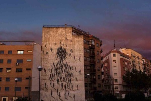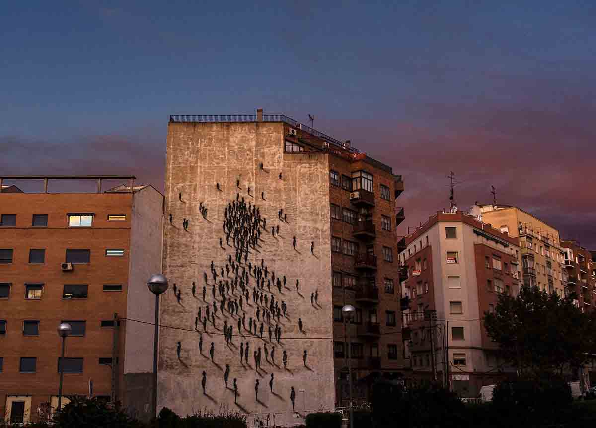 Per questa parete madrilena l’artista gioca in casa elaborando su questo grande spazio un intensa figura a mezzo busto di un uomo, attraverso il suo canonico stile l’interprete spagnolo escogita il consueto archetipo, spazio quindi nuovamente alla serie ombre nere che avvicinandosi tra loro danno vita ai lineamenti ed al corpo del soggetto.