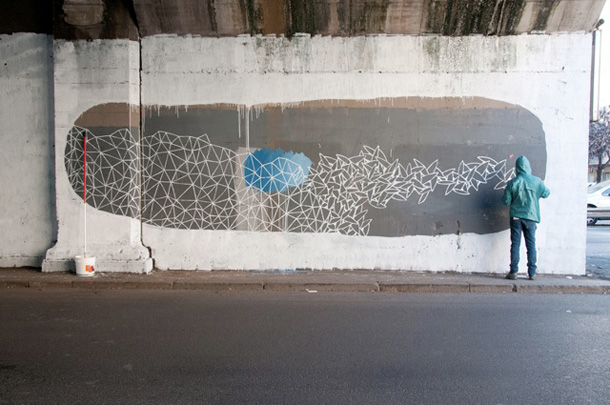 Tellas ha iniziato così a dipingere una delle sue figure tondeggianti, questa volta optando per uno spettacolare cambio di motivo interno, passando da minuscole figure astratte, alle canoniche foglie, molta curiosità nel vedere come andrà poi a completare il tutto.
