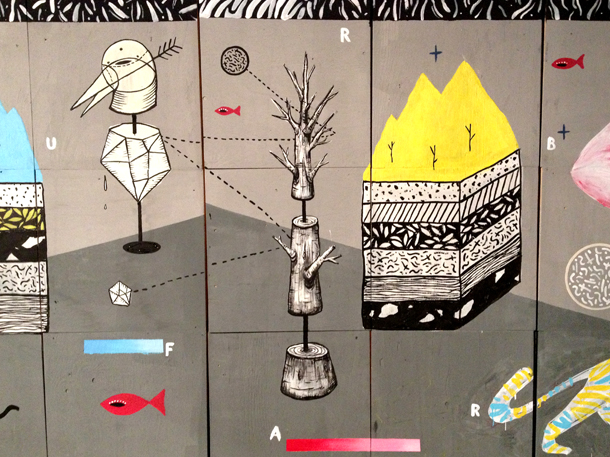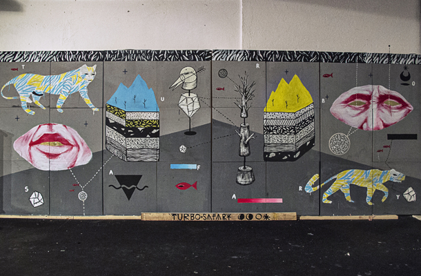 Turbosafary è abbracciare un immaginario fitto dove la natura, dove uomini, animali, geometrie, numeri e lettere si mescolano e danno vita a qualcosa di nuovo, Turbosafary è camminare nel selvaggio, svegliarsi attorniati da fitti fili che collegano tutto, addentrarsi nei colori, passare per le bestie siano esse uomini od animali veri e propri, ed emergere tra alberi, terra e natura
