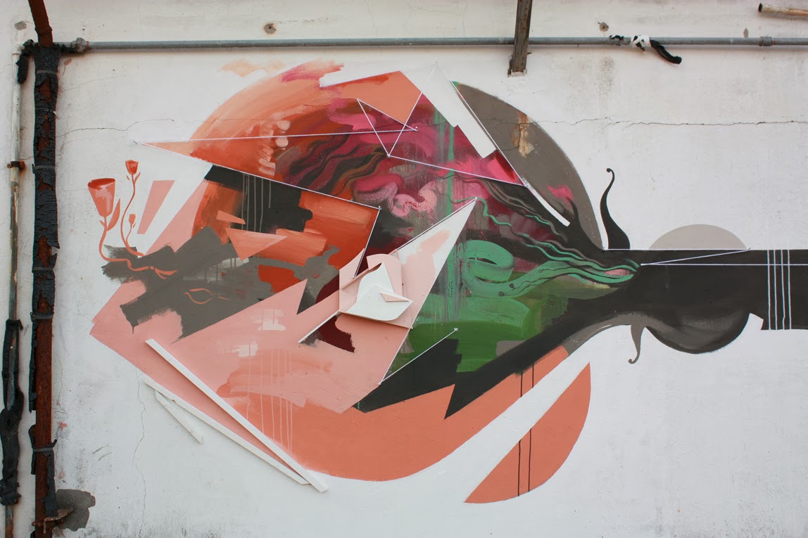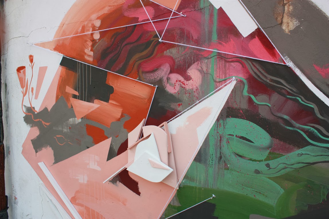 L’ultimo lavoro, come il titolo suggerisce, vede di Xabier XTRM realizzare la forma di una chiave, l’artista simula il movimento dell’ingresso della stessa dentro la serratura – notare il filo che attraverso il lavoro fino alla parete adiacente – concentrando però i propri sforzi sulla parte dell’impugnatura, vero e proprio cuore di tutta la realizzazione. L’artista esibisce i consueti giochi geometrici e tridimensionali, immettendo all’interno delle configurazioni una serie di colori caldi e restituendo la sensazione di un liquido che si muove e si anima all’interno dello spazio, splendido.